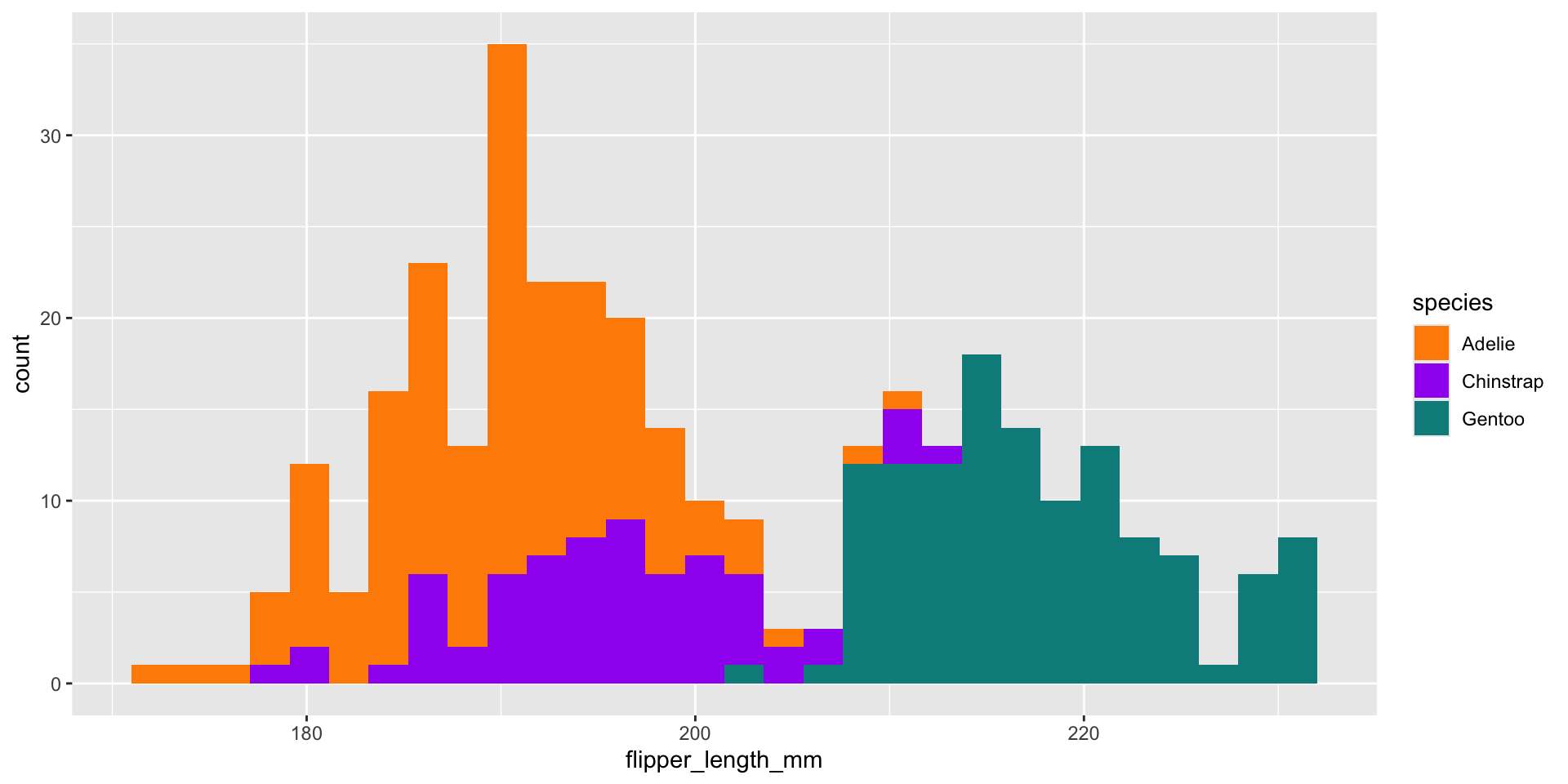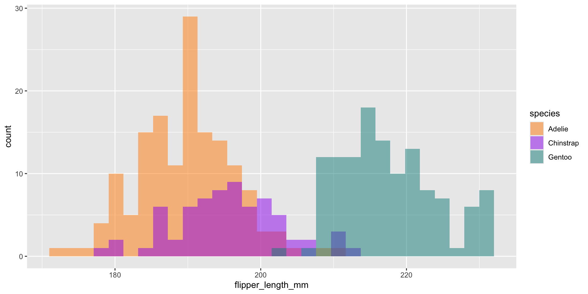ggplot(penguins, aes(x = flipper_length_mm, fill = species)) +