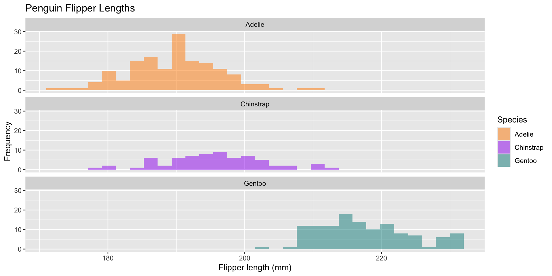 labs(x = "Flipper length (mm)", y = "Frequency", fill = "Species",