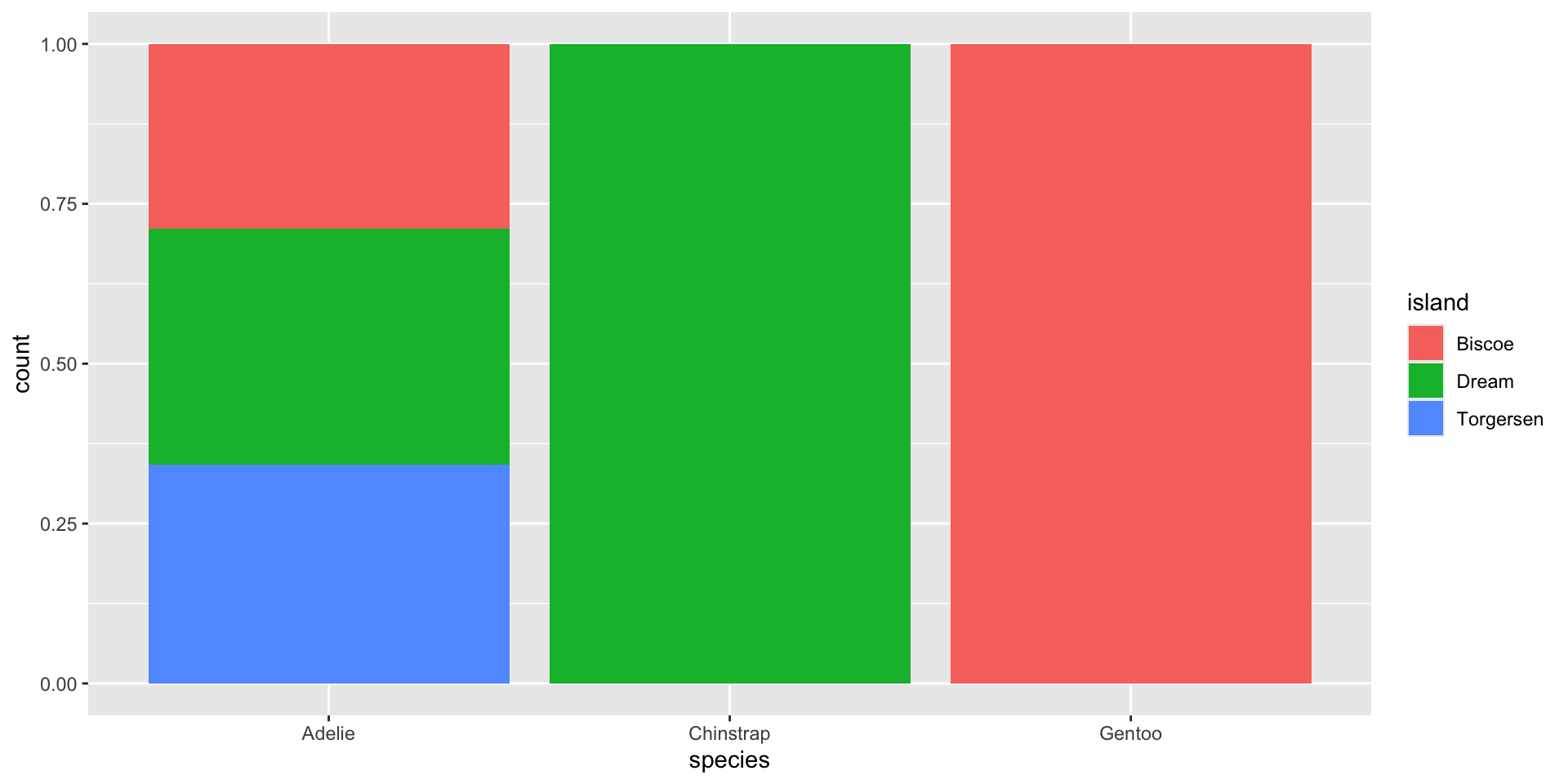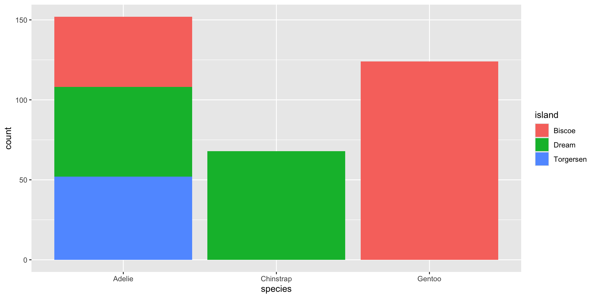 Every geom has a default position. The default position used in geom_bar() is stack, which stacks bars on top of one another, based on the fill value (here, that’s island):
