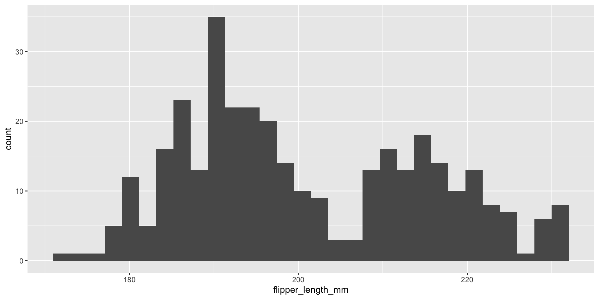 In this next example, we’ll explore penguin flipper lengths. For this example, we’ll focus on understanding the following layers of a ggplot (bolded):