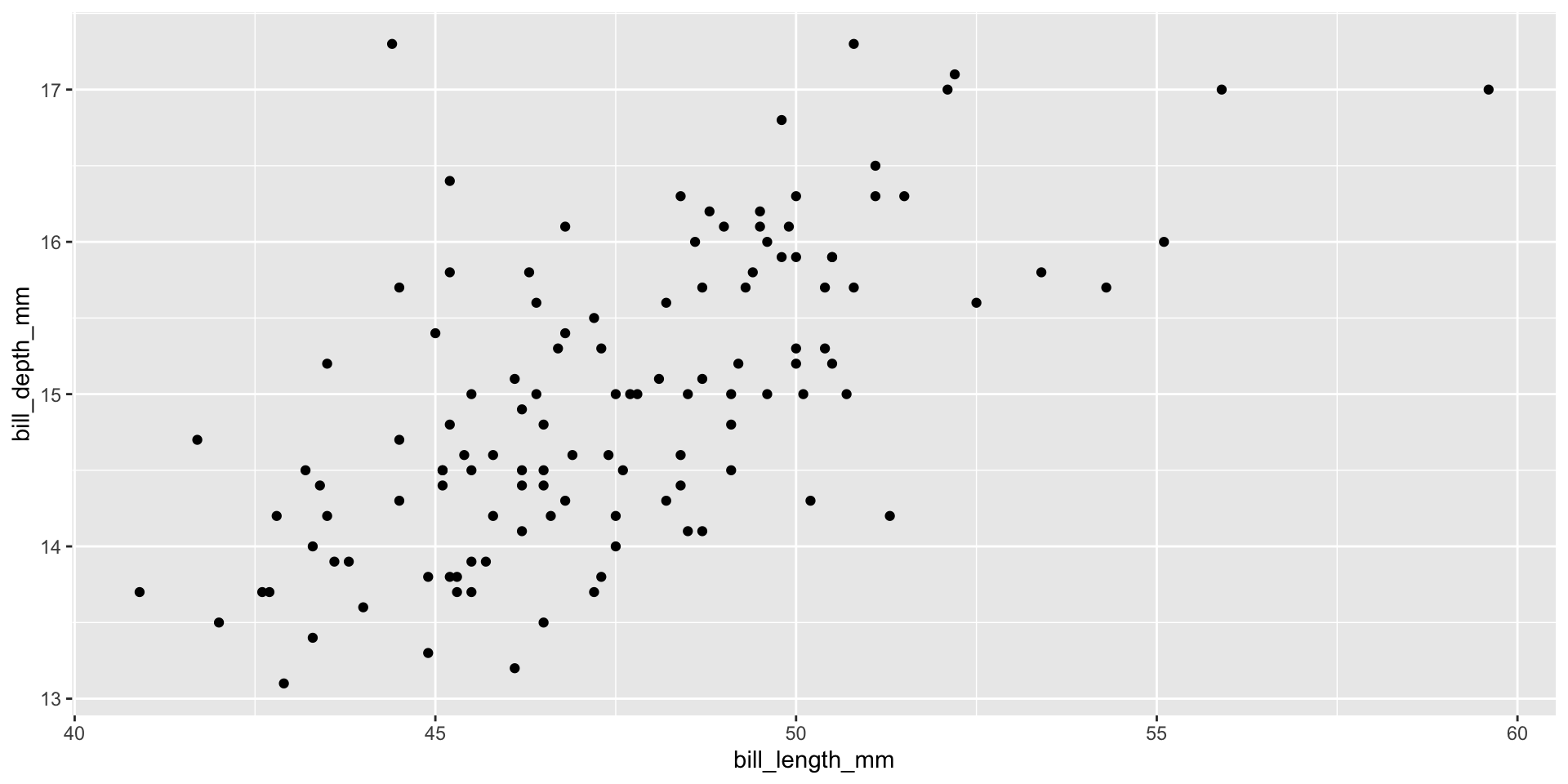 We’ll start by exploring the relationship between penguin bill length and bill depth. For this example, we’ll focus on understanding the following layers of a ggplot (bolded):