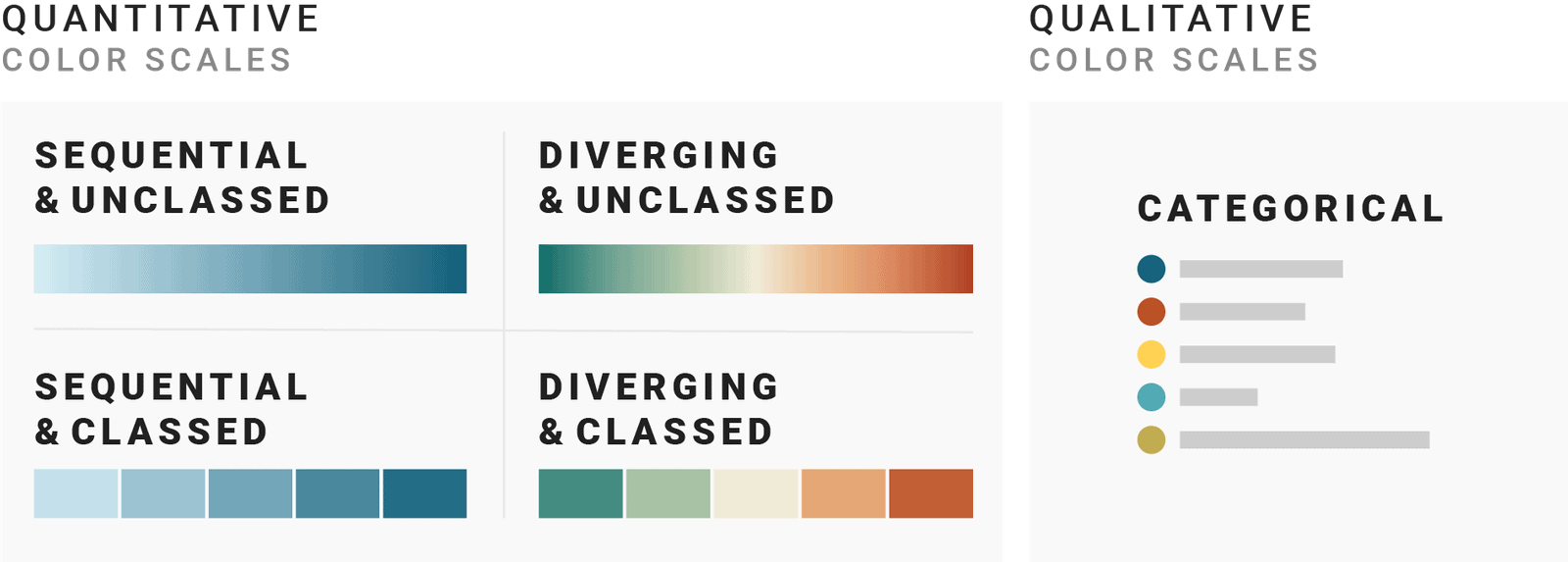 scale types & when to use which (quantitative vs qualitative; sequential vs. diverging, classed vs. unclassed)