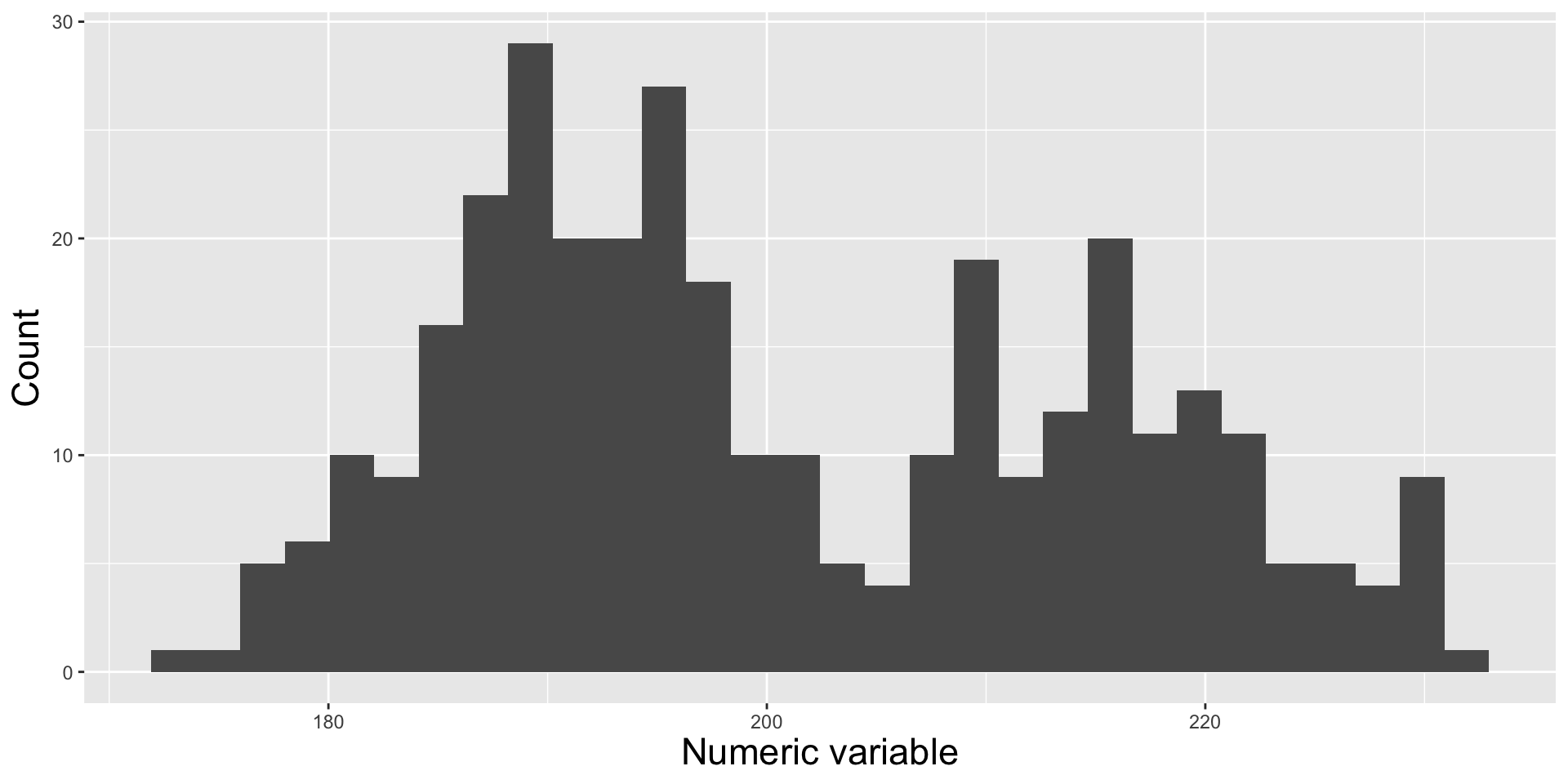 Modify binwidth (30 bins by default) – does a bin width of 1 (degree Celsius) actually make sense? Consider scale of interest. Also be mindful when using bins – too few bins will result in loss of distribution shape.