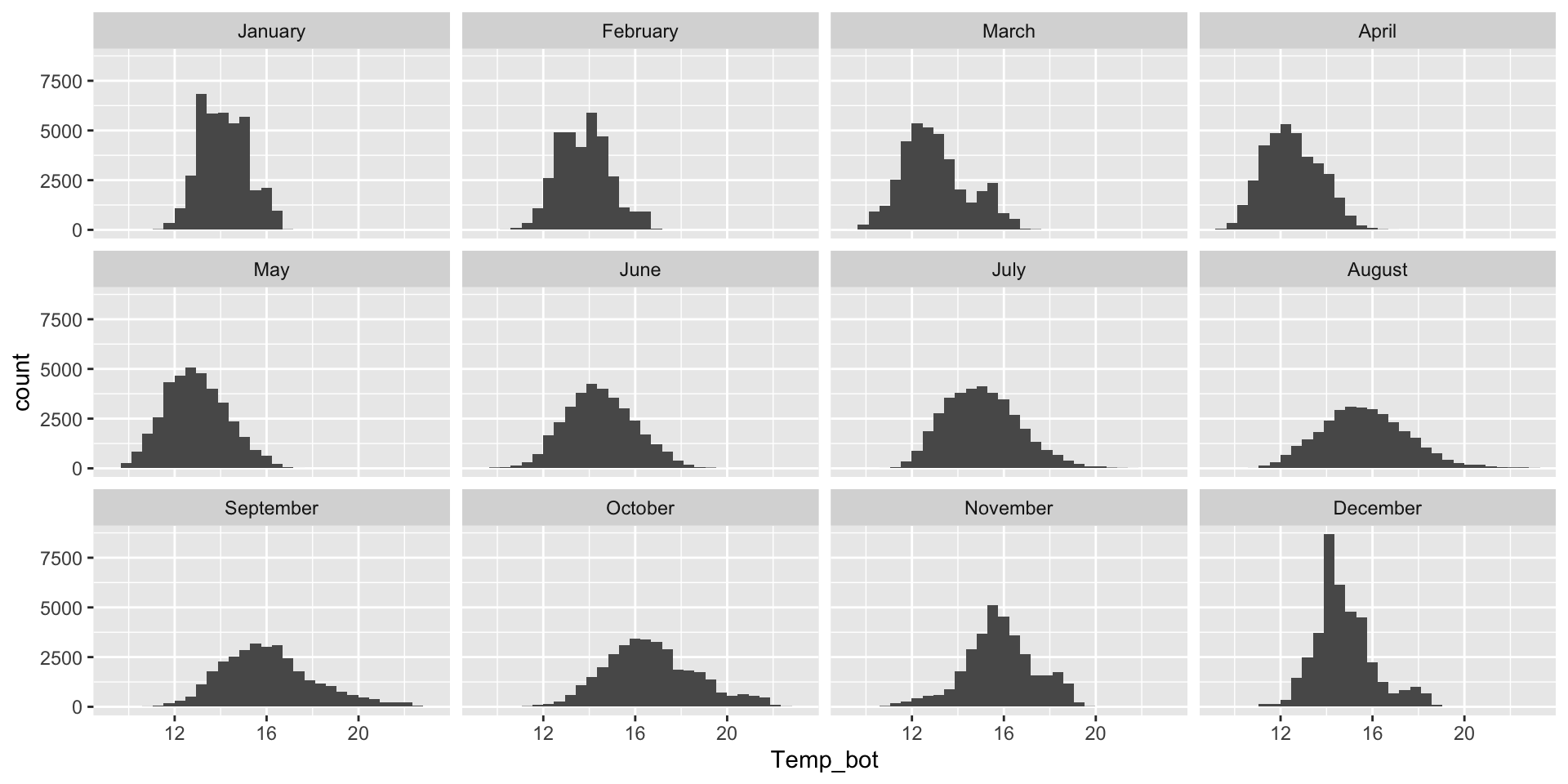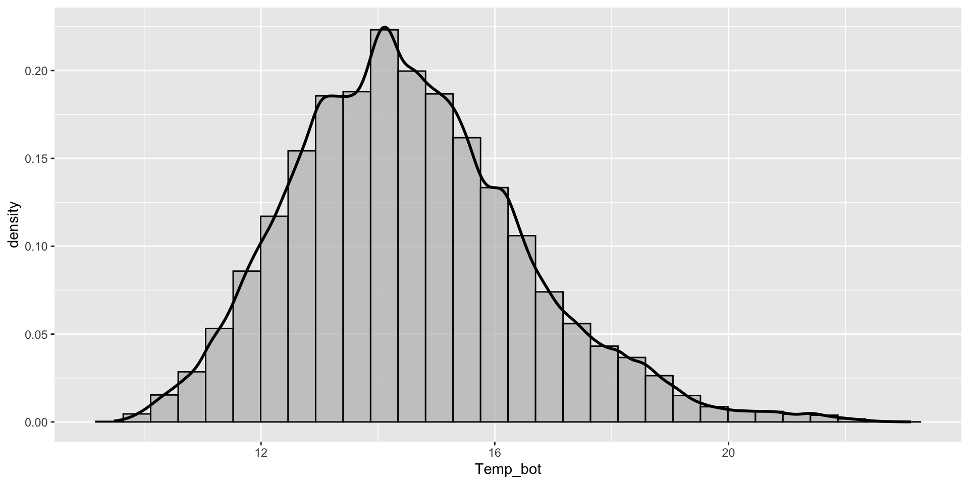 missing_temps <- naniar::vis_miss(bottom)Histograms - ggplot2::geom_histogram()