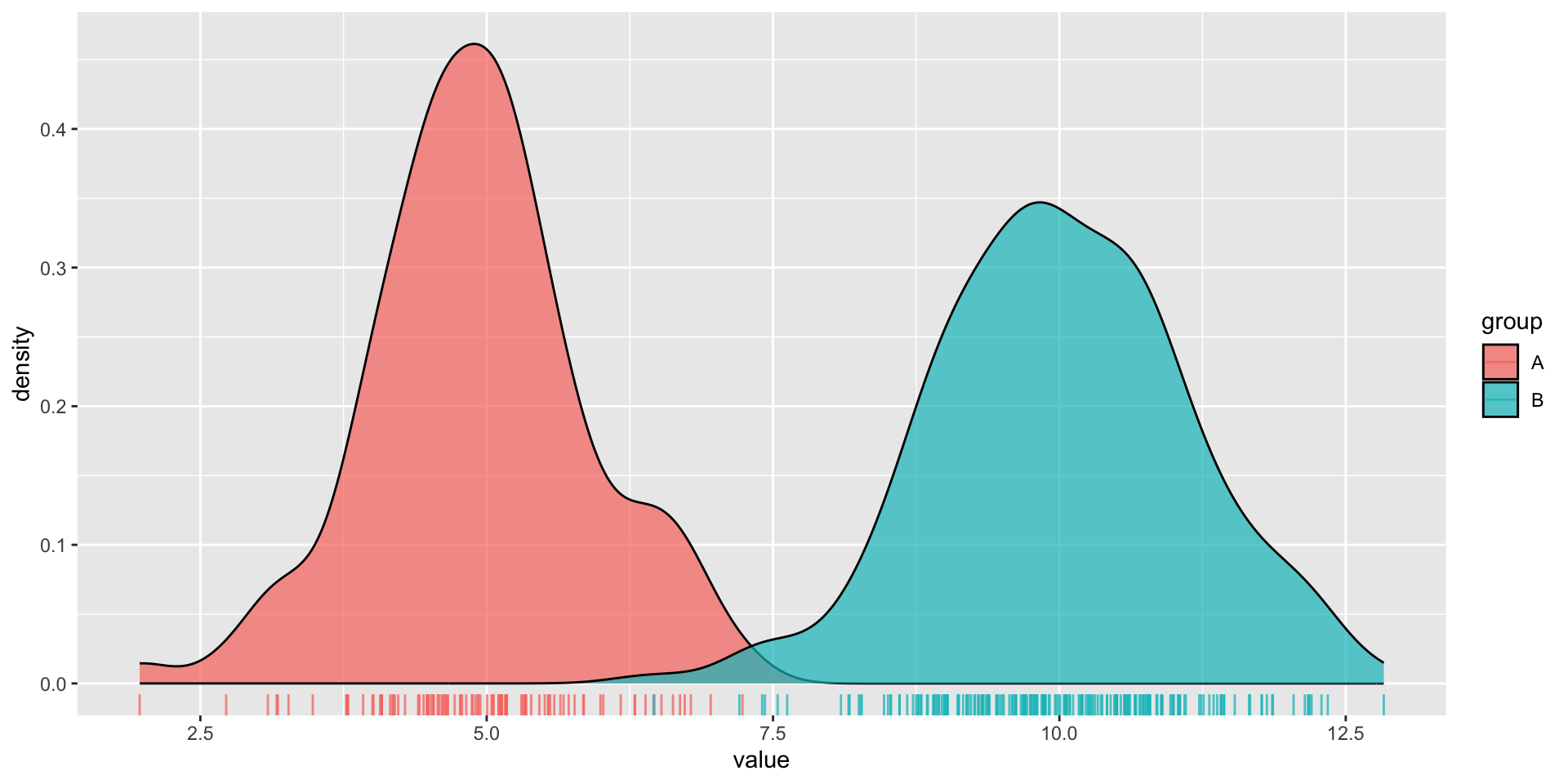 We lose information about sample size in our density plot (note that both curves are ~the same height, despite group B having 2x as many observations). However, they’re great for visualizing the shape of our distributions since they are unaffected by the number of bins.