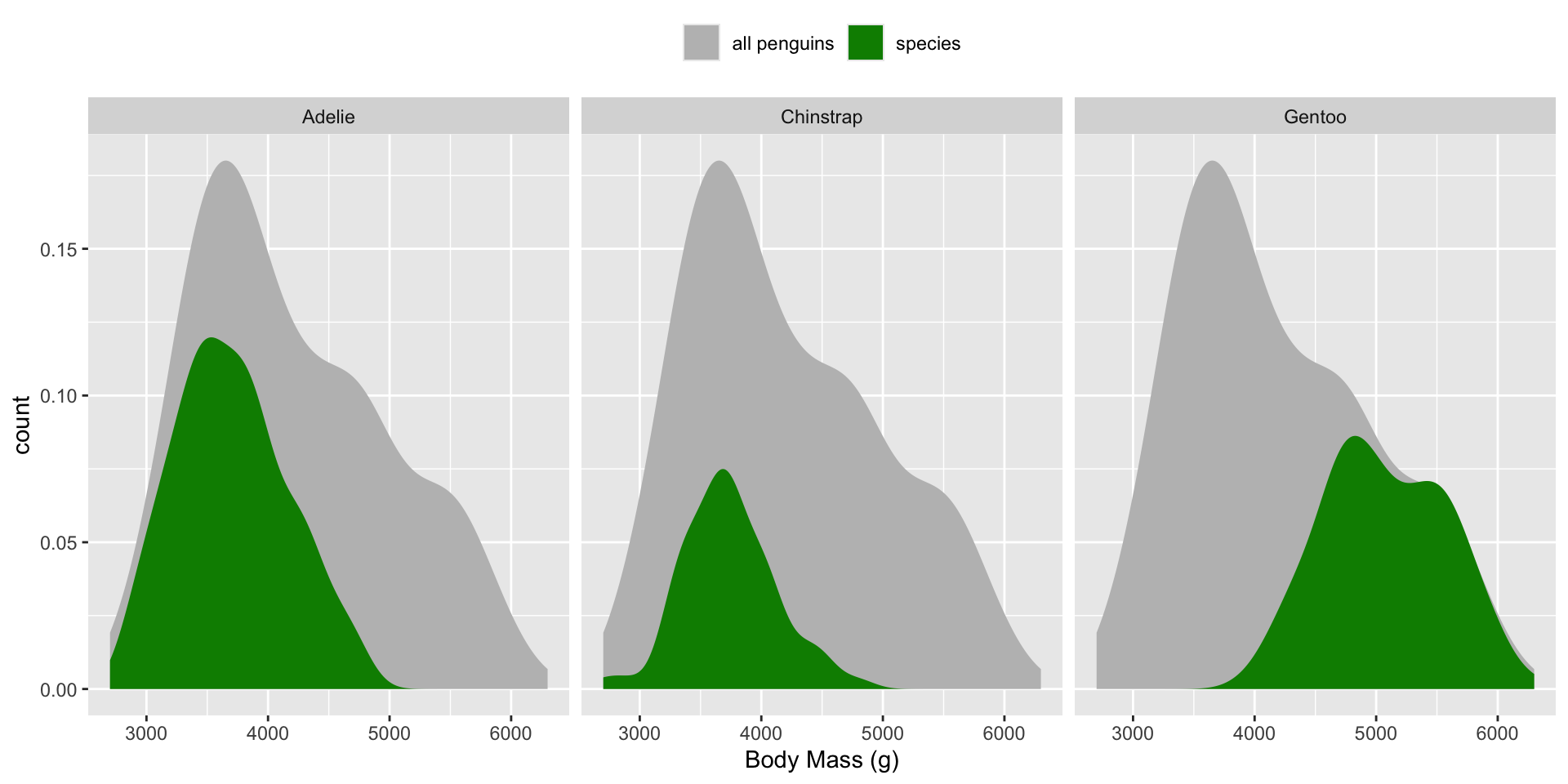 We can use scaled density plots to compare individual group distributions to the total distribution. Demonstrated here, using the penguins data set: