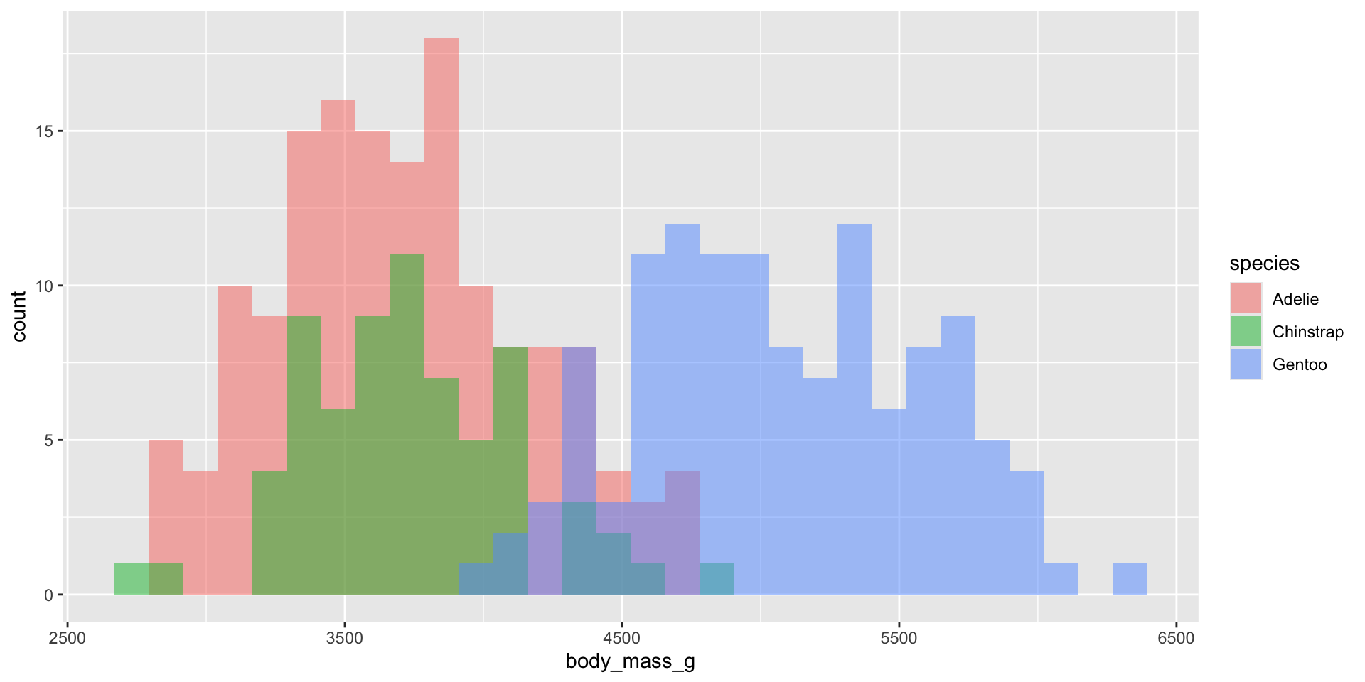 Examples show the distribution of penguin body masses (g) for Adelie, Chinstrap & Gentoo penguins.