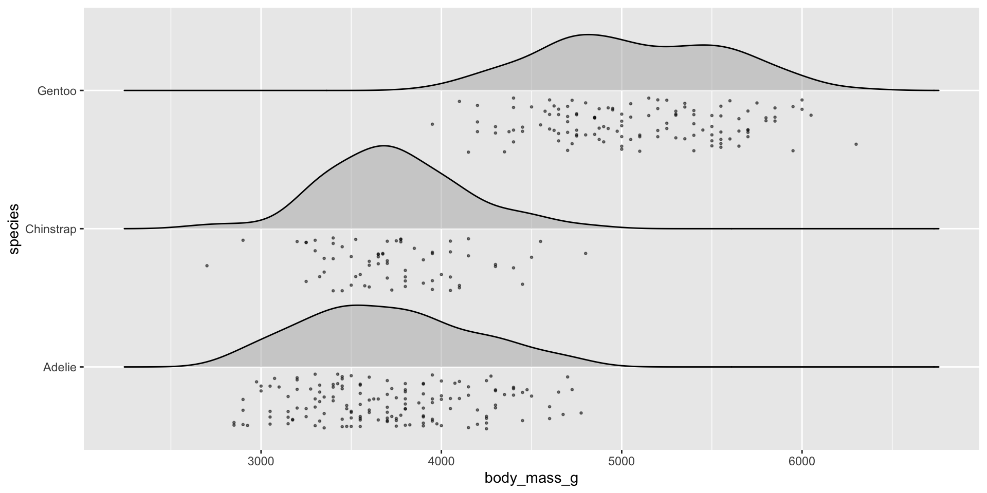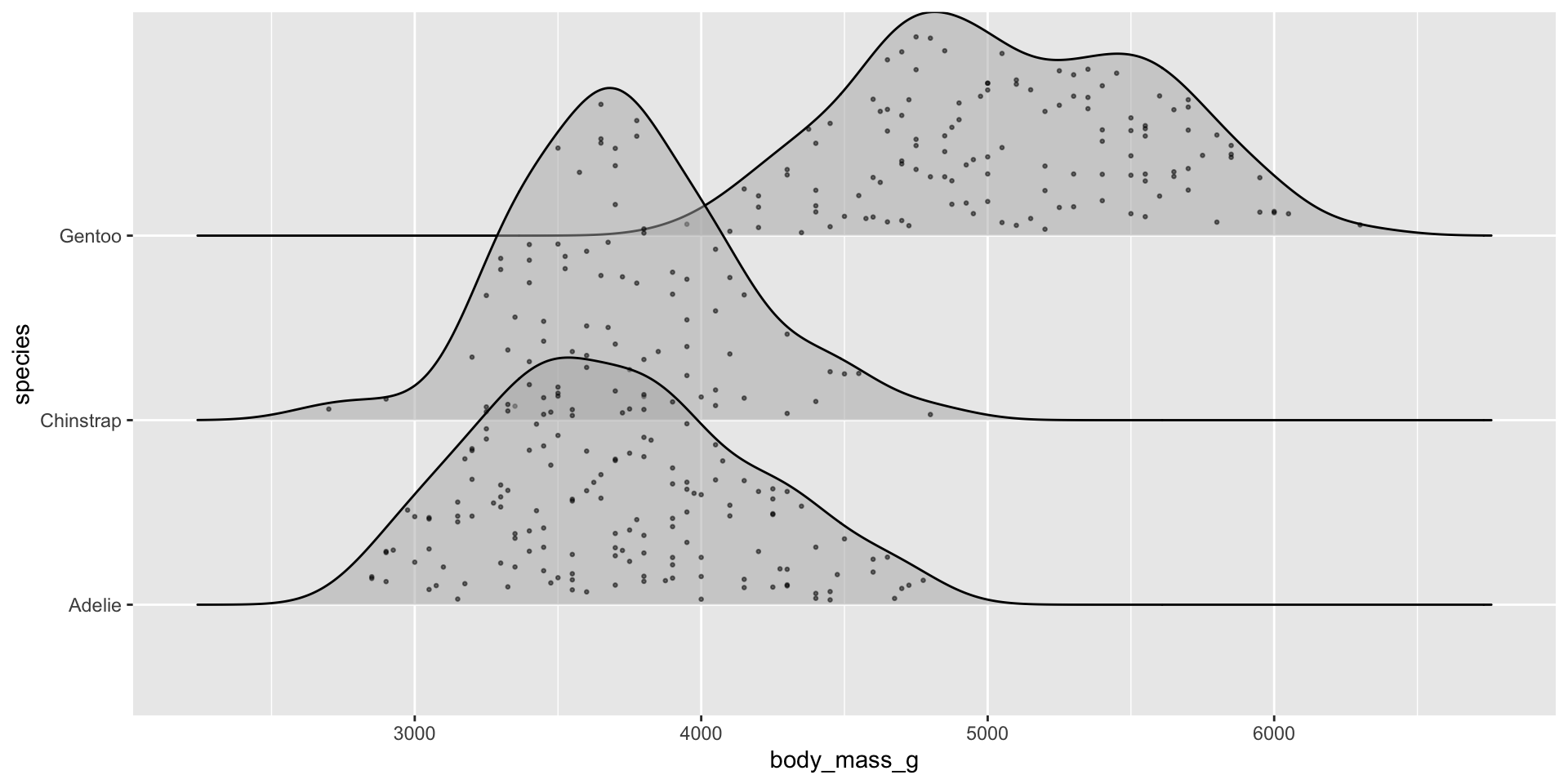 Visualize the raw data underlying the density ridges (since our temperature data is too large (>473,000 rows), so we’ll use the {palmerpenguins} penguins data set to demo):