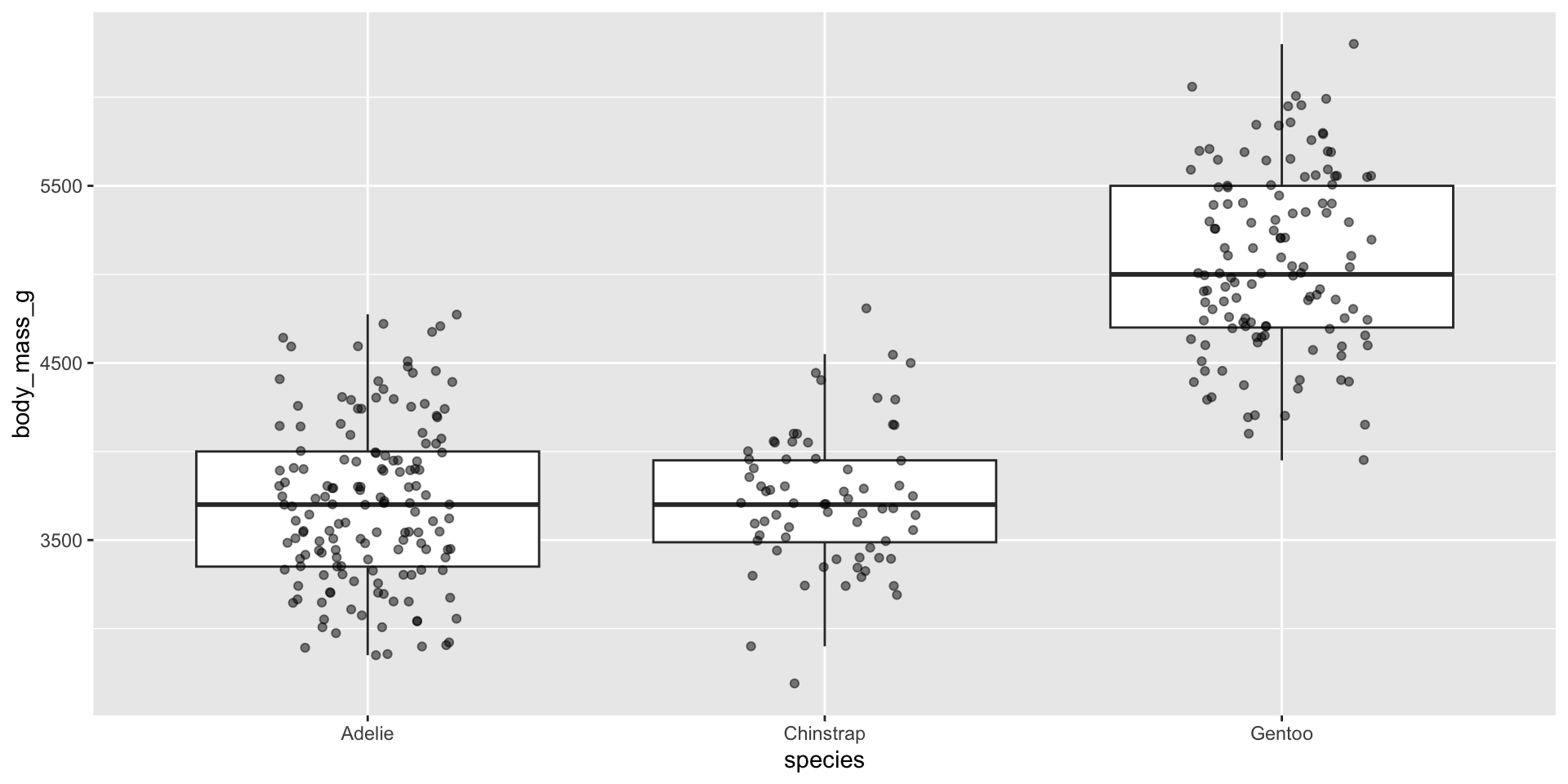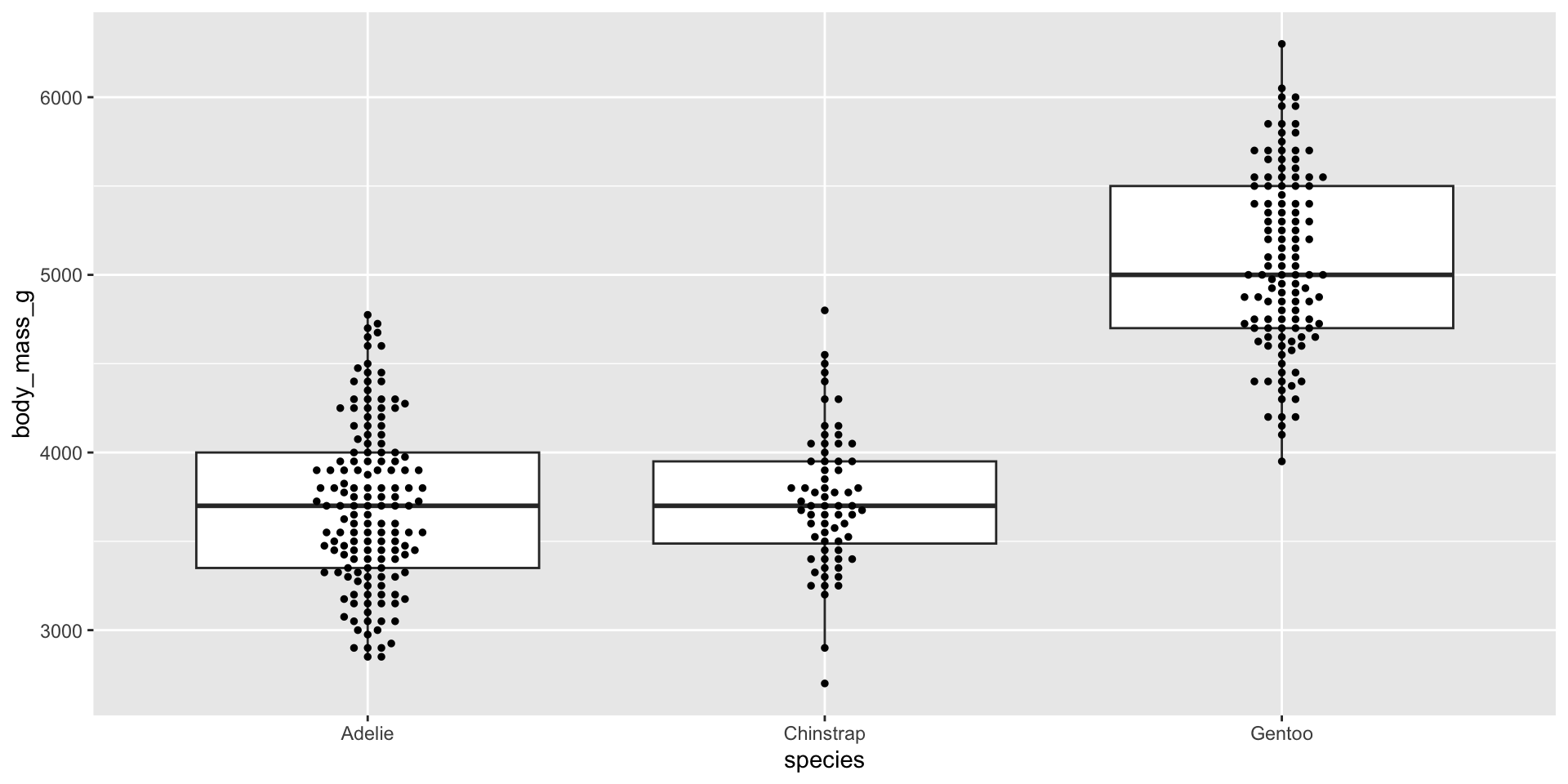Since box plots hide sample size, consider overlaying raw data points using geom_jitter() (since our temperature data is too large (almost 500k rows), we’ll use the penguins data set to demo):