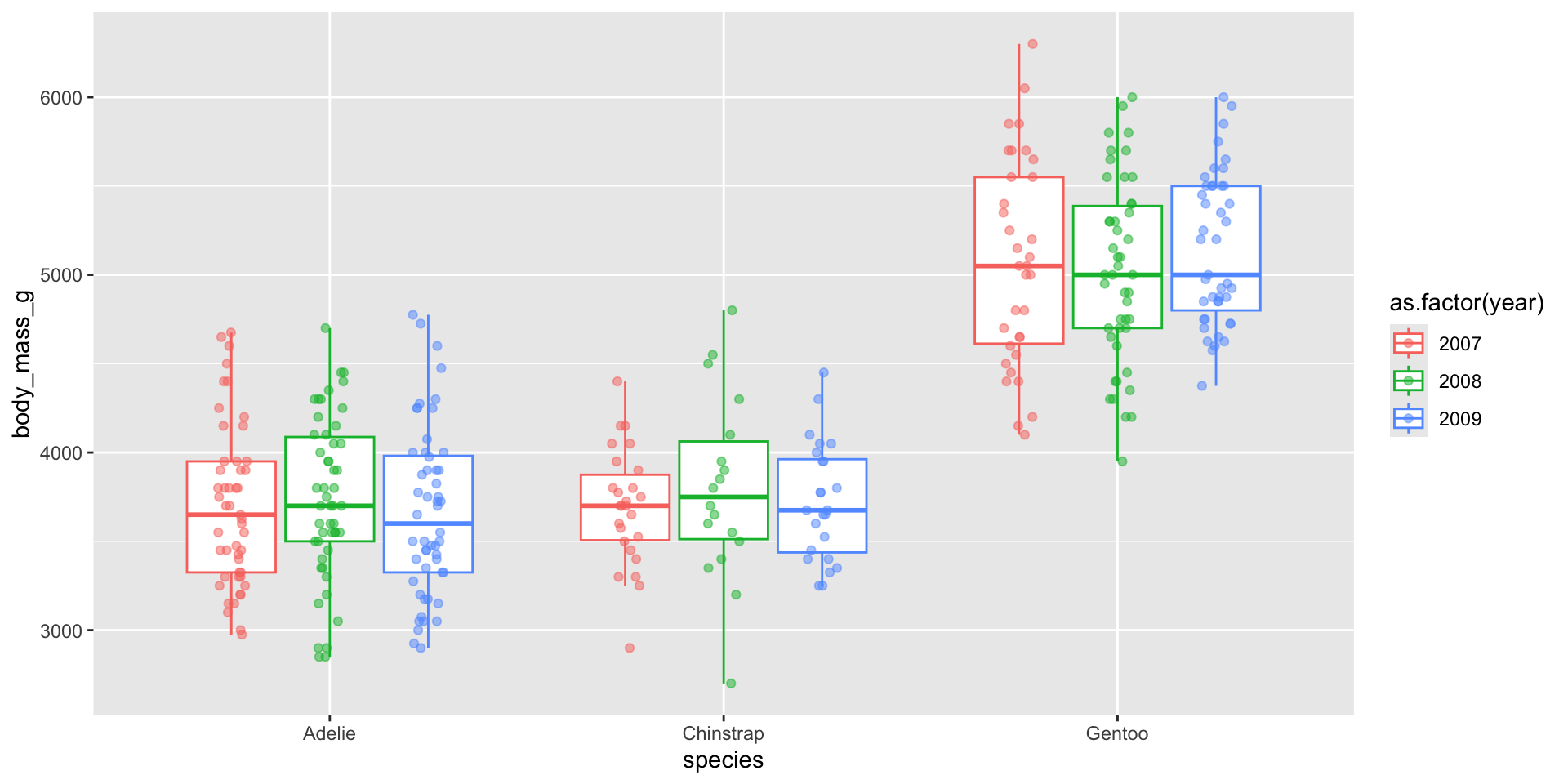 You may have data where you want to include an additional grouping variable – for example, let’s say we want to plot penguin body masses by species and year. We’ll need to at least dodge our overlaid points so that they sit on top of the correct box. Preferably, we both jitter and dodge our points: