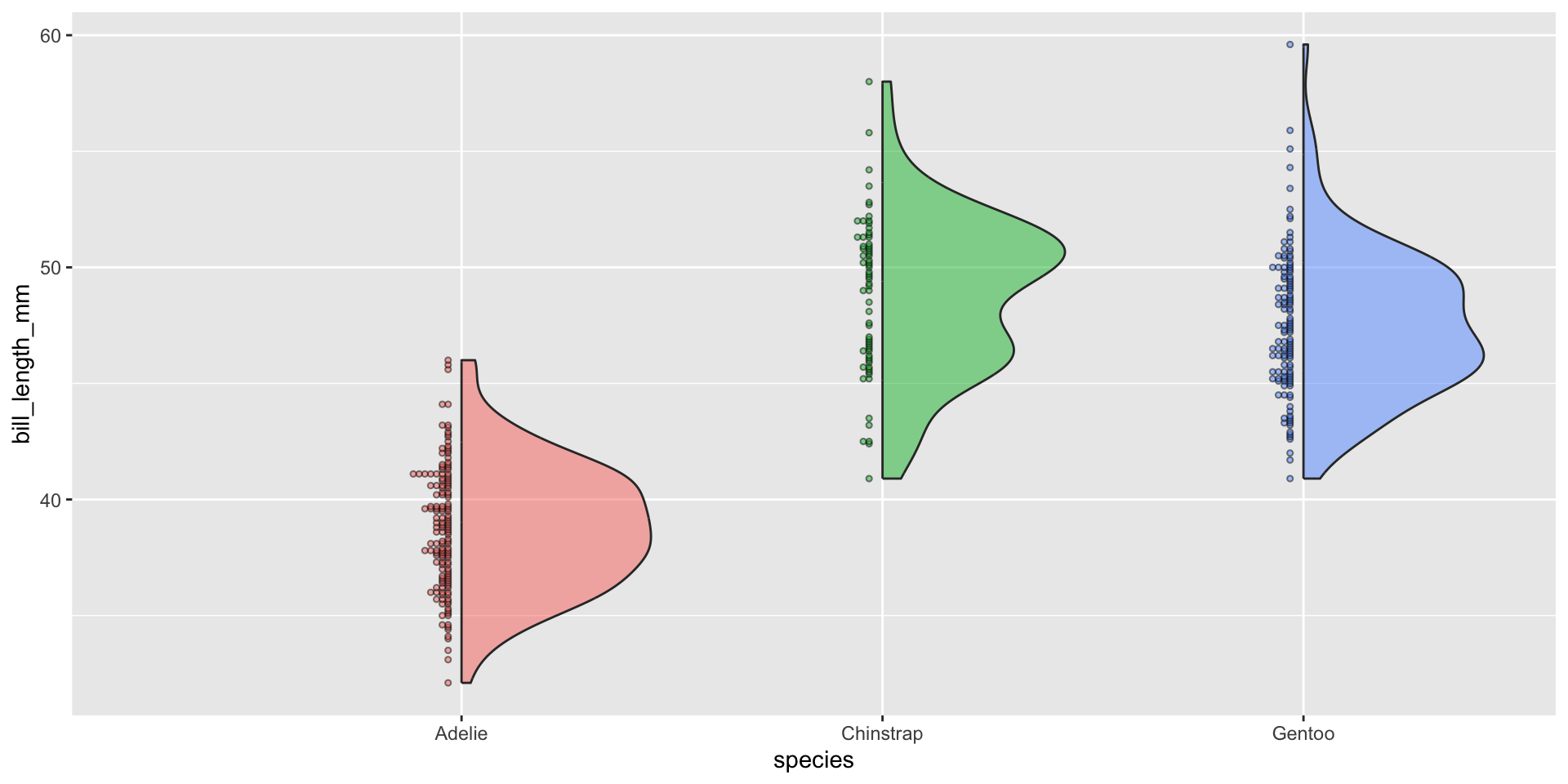 The {see} package provides geom_violindot(), which is useful for simultaneously visualizing distribution and sample size. Because it can quickly get overcrowded with large sample sizes (like Temp_bot), we’ll use penguins to demo here: