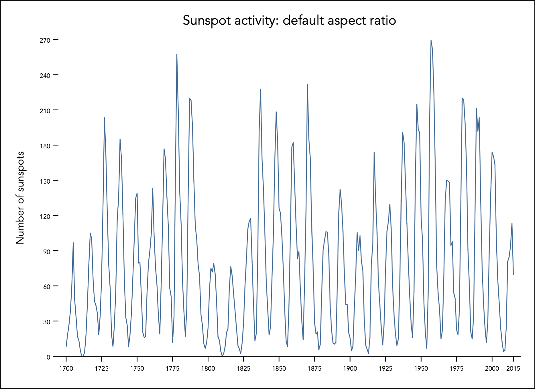 Consider this line graph of sunspot activity from 1700 - 2015. It was created using Stata’s default aspect ratio. Can you easily identify where in time sunspot activity rises more quickly / sharply than others?