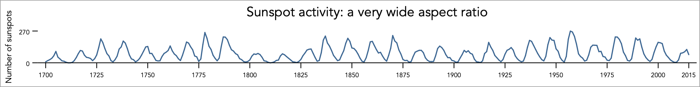 With a wider aspect ratio, we can more clearly see the differences in rates of change (slopes) in sunspot activity through time.