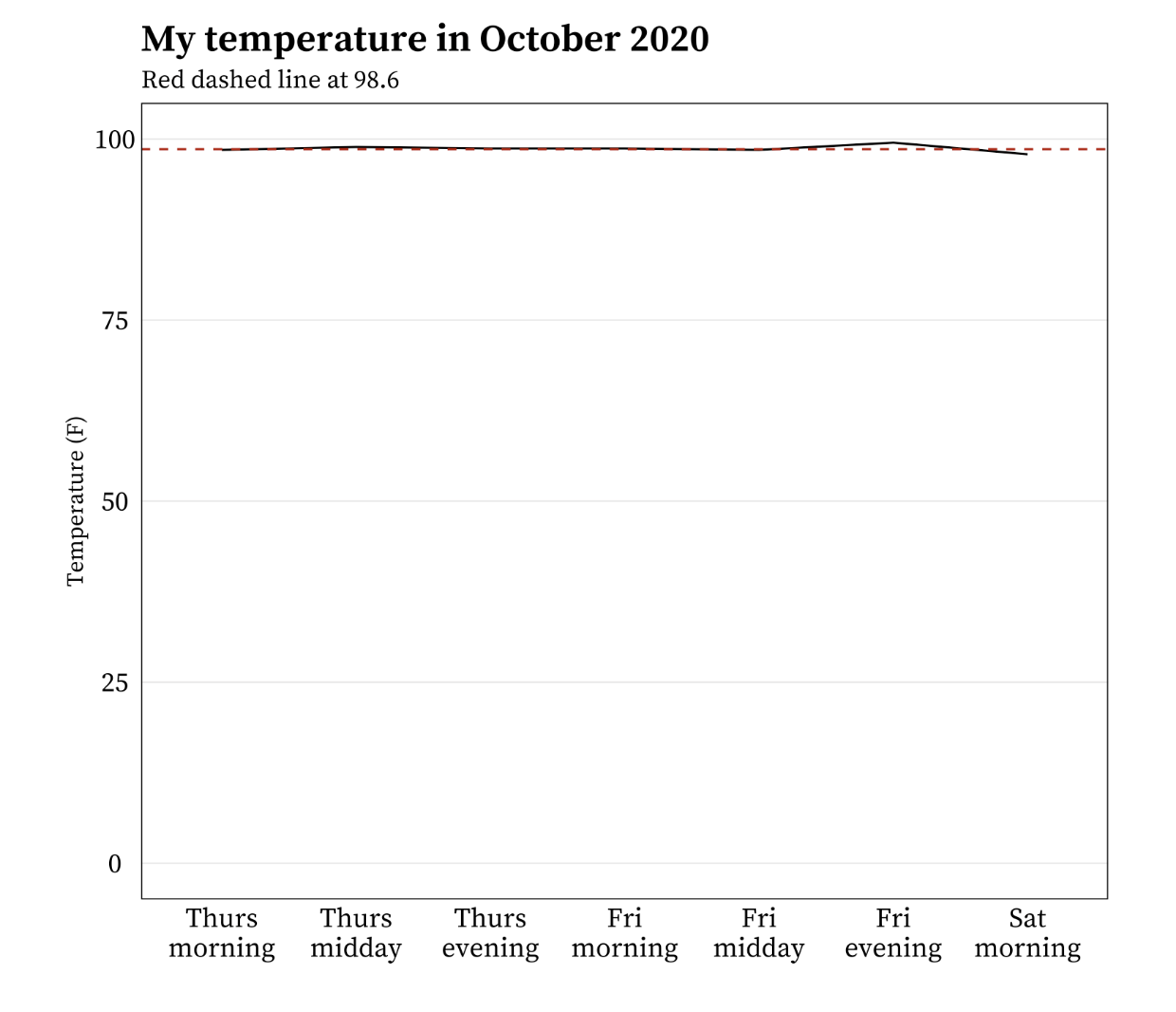 Do not start the y-axis at 0 if the range of data is small but the distance from the bottom of the range to zero is large. For example: