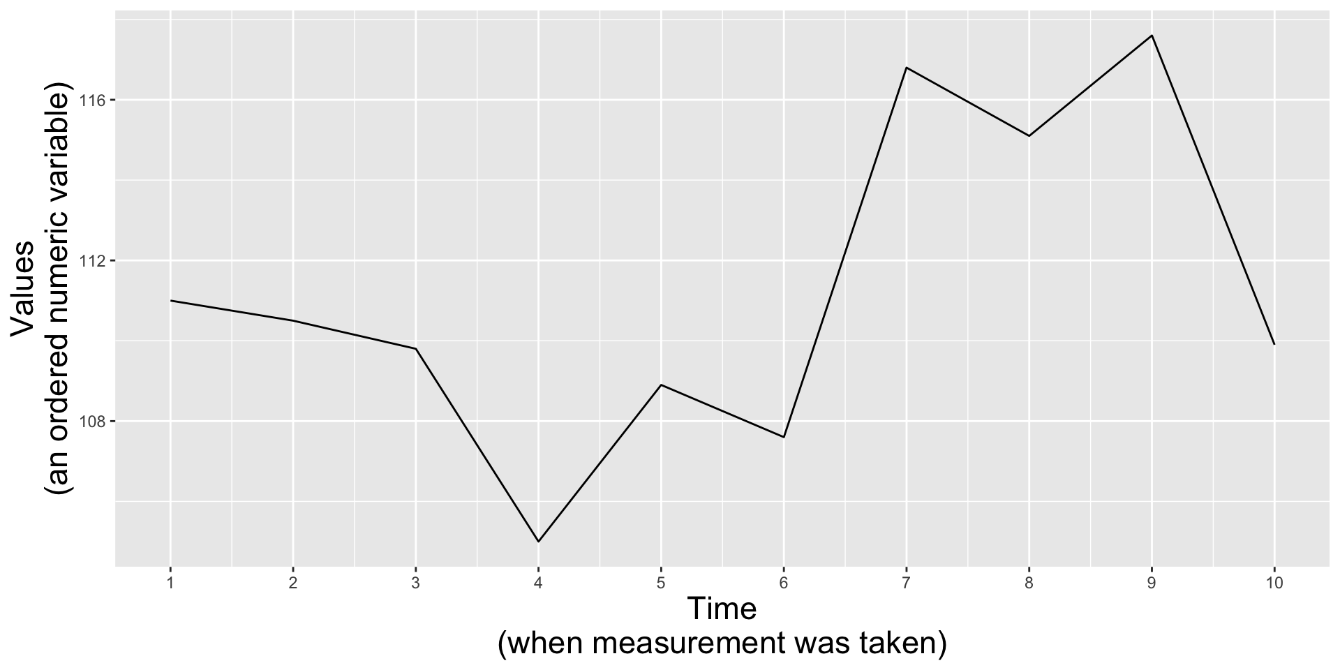 Instead of just a line or scatter plot to indicate the change in a numeric variable through time, the space between the line and the x-axis is colored or shaded in. Area plots are sometimes criticized for violating the data-ink ratio rule, which argues that any non-data-ink should be omitted wherever possible. If the number of observations is low (as in this example) a connected scatter plot may more clearly show when each observation was made.