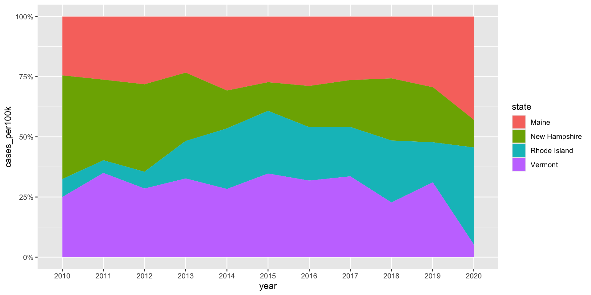 Stacked area charts are useful for showing the evolution of a whole and the relative proportions of each group that make up the whole. For example, the top of the colored area shows the total Lyme disease incidence (# cases / 100k people) across all groups (notice the difference in y-axis values), while the individual colors are the relative contributions of the top 4 states with the highest lyme disease incidence: