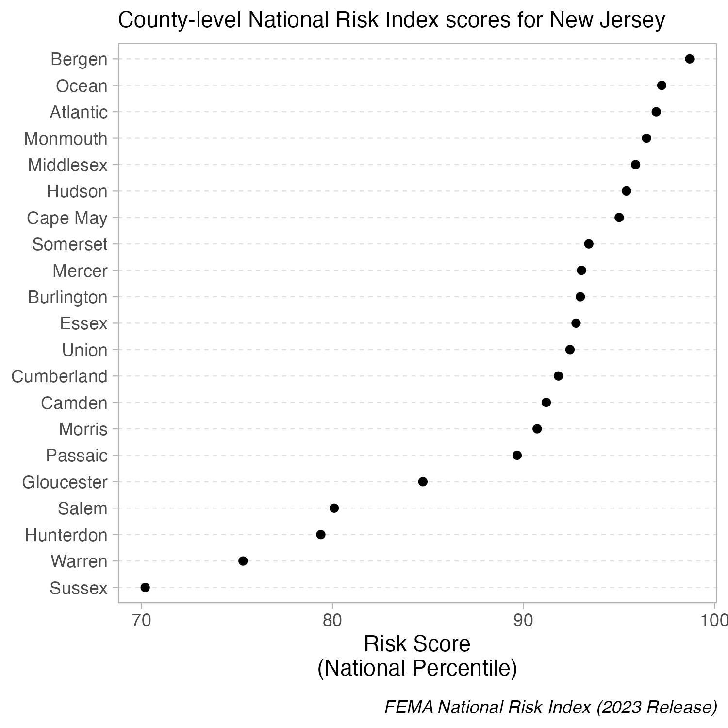 When bars are all long and have nearly the same length, the eye is drawn to the middle of the bars rather than to their end points. A lollipop plot is a bit less distracting (less ink), but still difficult to differentiate risk scores across counties. When we limit the axis range in a dot plot, it becomes easier to identify differences in the max and min values.