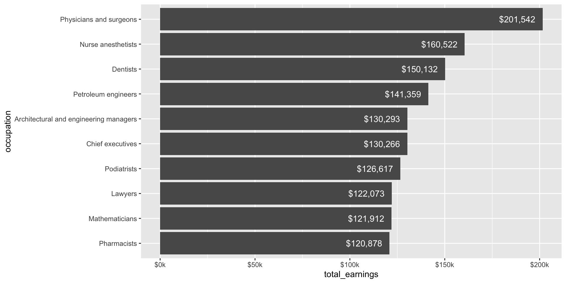 Give those long x-axis labels some breathing room using coord_flip(), which flips cartesian (x,y) coordinates so that the horizontal becomes the vertical and vice versa. Alternatively, you can map your variables to the opposite axes in aes() (e.g. aes(x = total_earnings, y = occupation)).