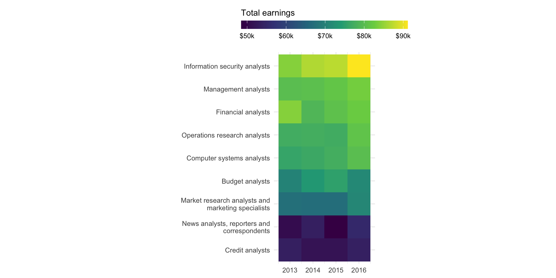 Let’s say we want to explore the change in total earnings through time for any “analyst” positions in our data set. We can use a heatmap to create a matrix that displays total earnings (numeric, continuous) by occupation (categorical) and year (categorical):