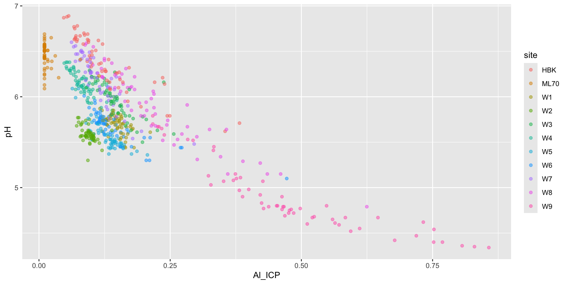 Rather than coloring points by site, we can map color to them based on our third continuous numeric variable, Al_ICP. We’ll also apply the viridis color map: