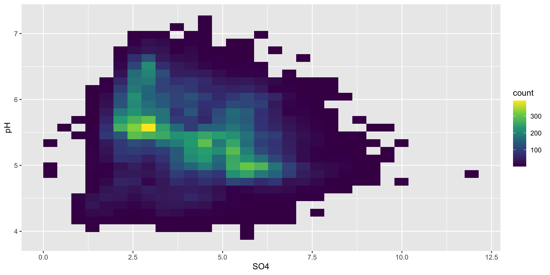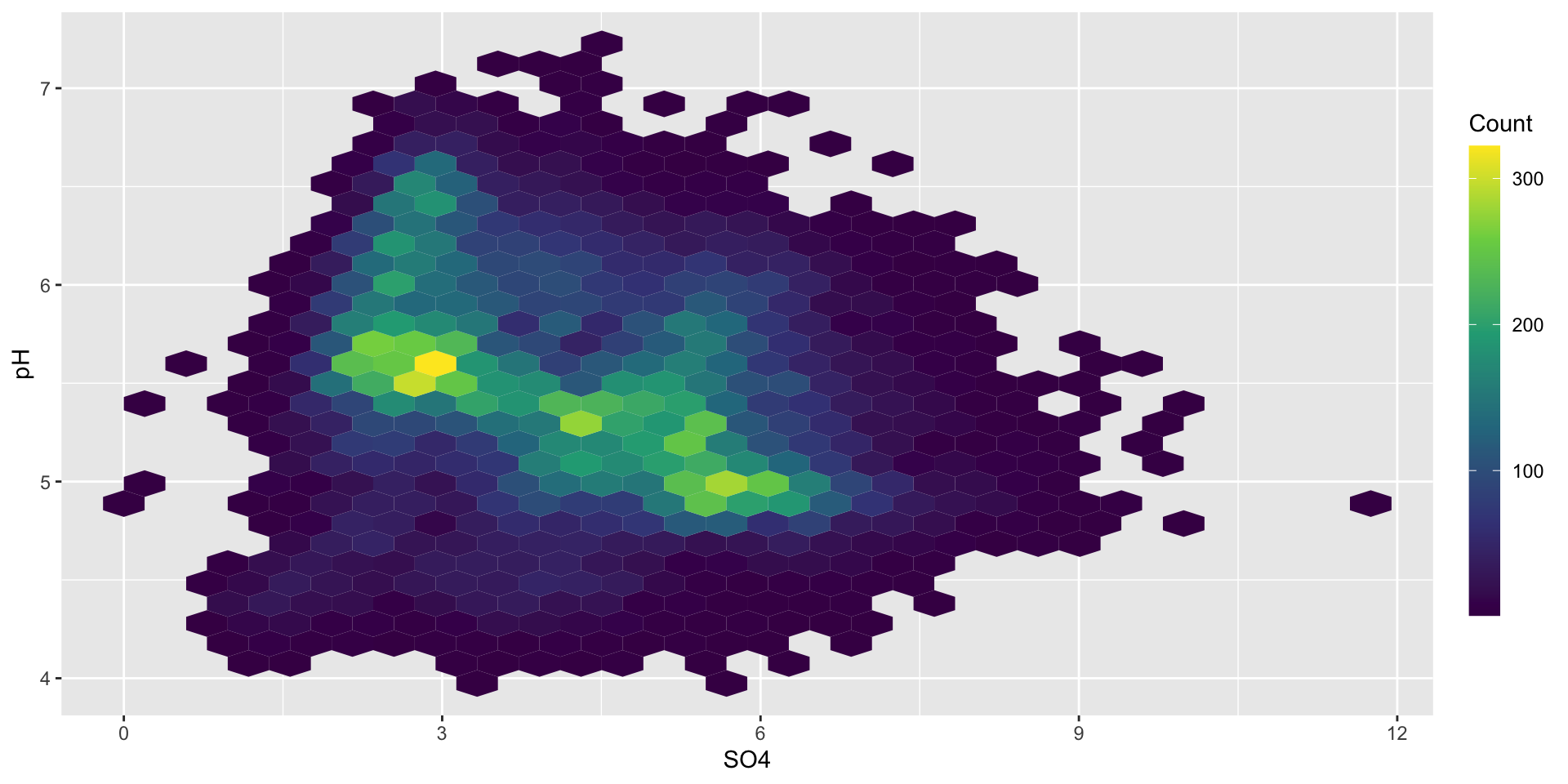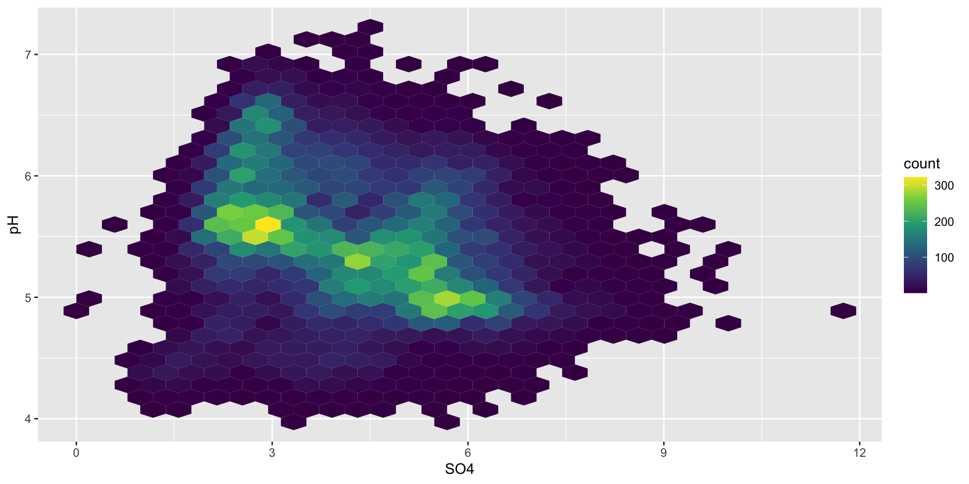 Sometimes, we just have too many data points for a traditional scatter plot to be effective. For example, what if we want to plot all data (not just the 2021 water year subset)? Here, we plot sulfate concentration (SO4) against pH: