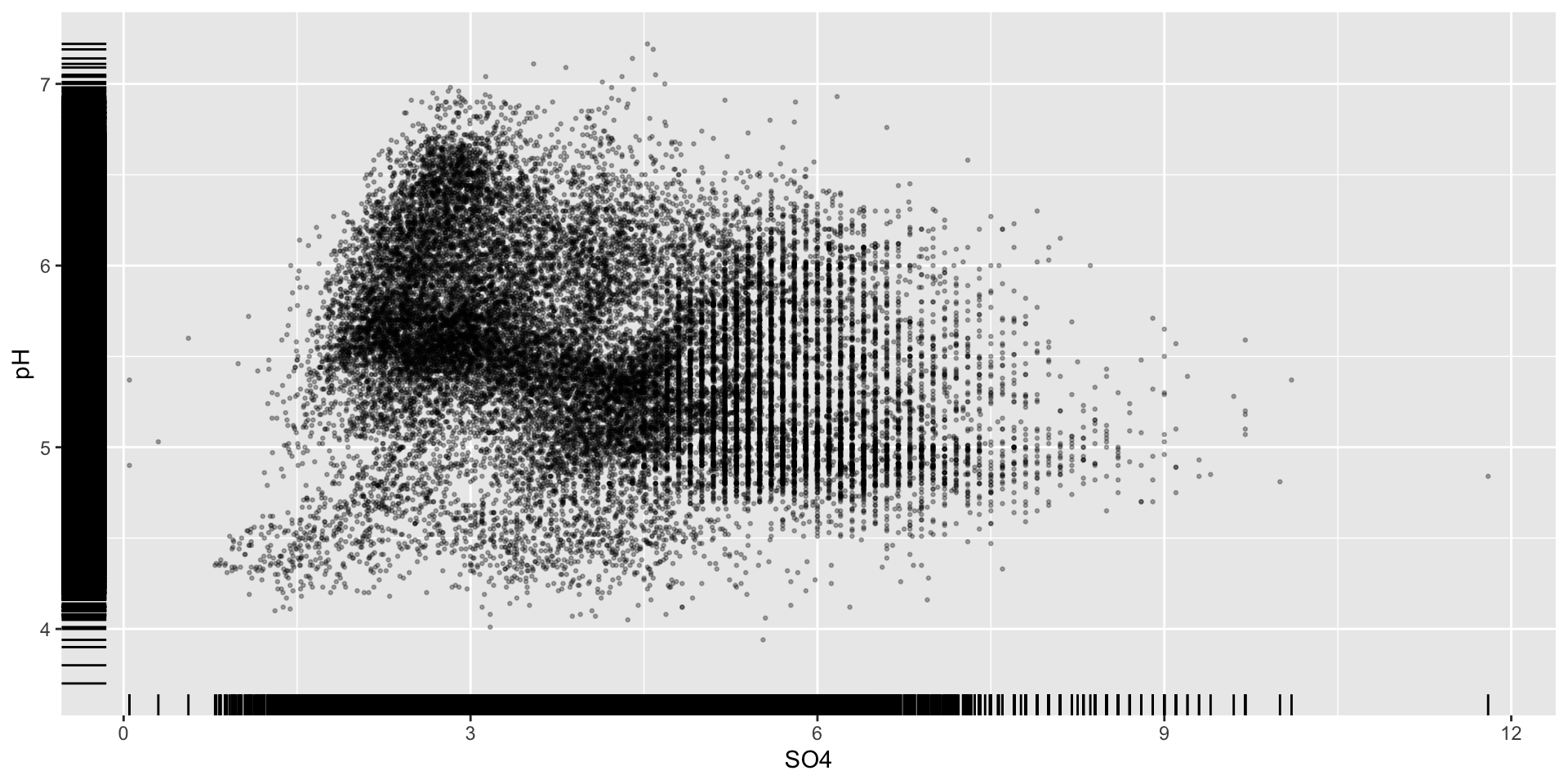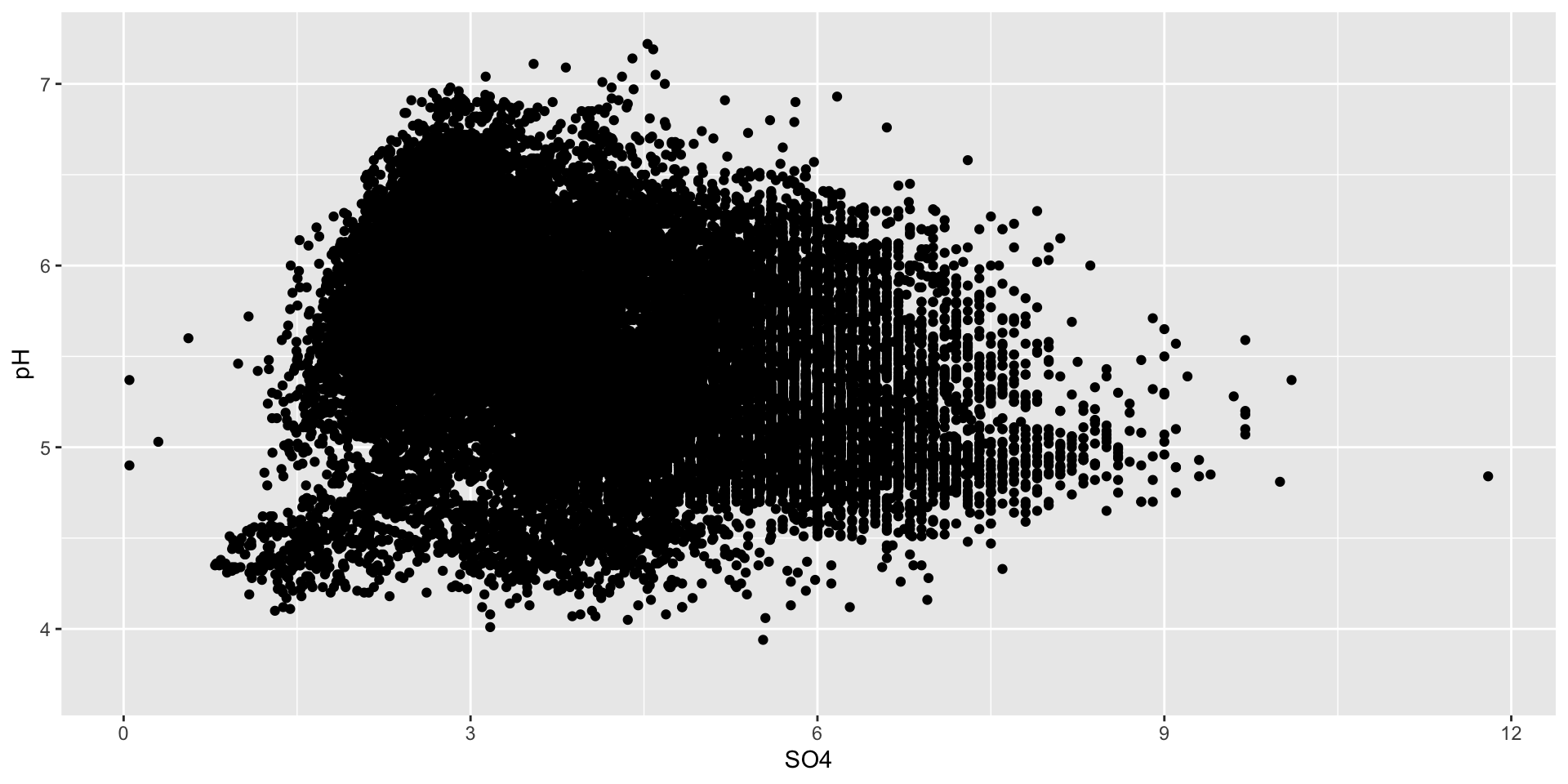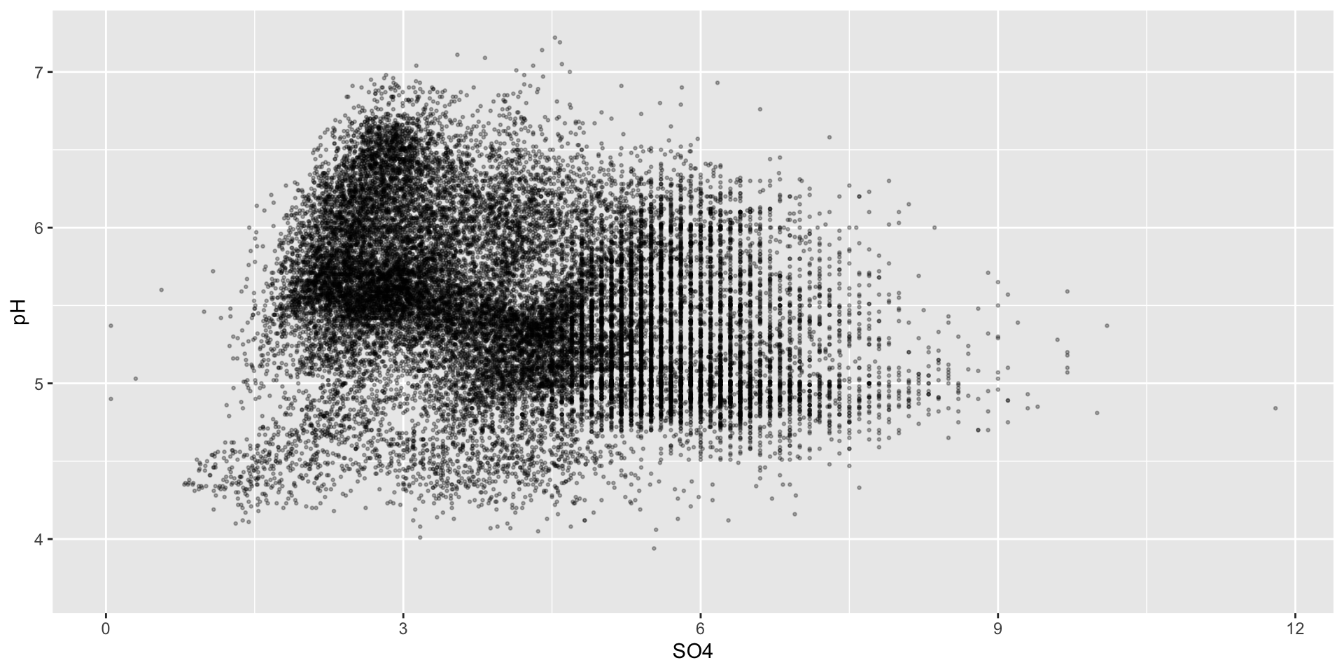 Sometimes, we just have too many data points for a traditional scatter plot to be effective. For example, what if we want to plot all data (not just the 2021 water year subset)? Here, we plot sulfate concentration (SO4) against pH: