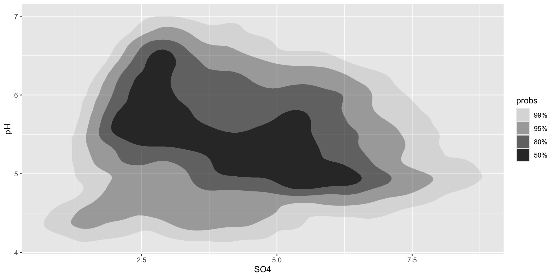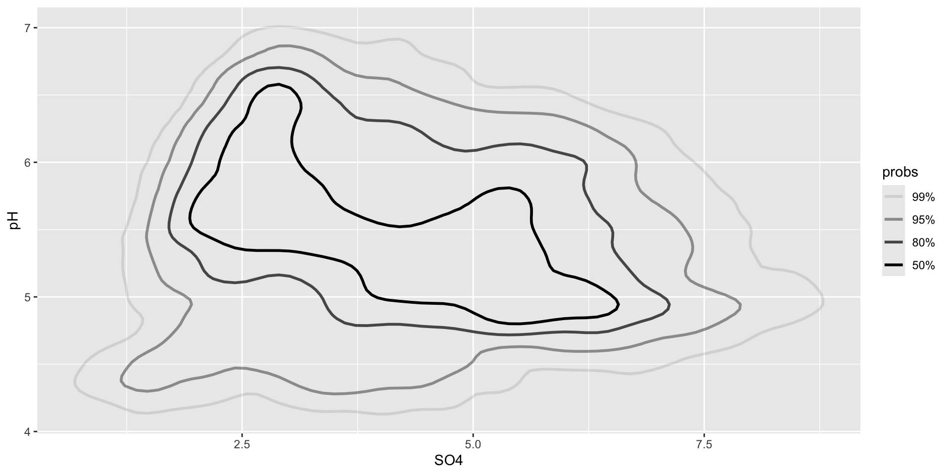 These geoms similarly perform 2D density estimation, then compute and plot the resulting highest density regions (HDRs). These HDRs are computed to be the smallest such regions that bound that level of probability. By default, regions show the 50%, 80%, 95%, and 99% HDRs of the estimated density (though this can be updated using the probs argument).