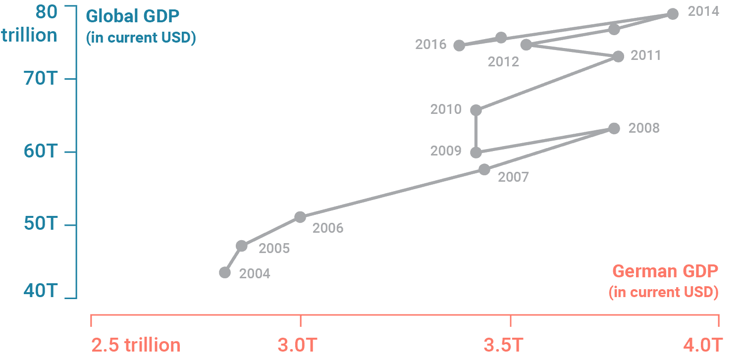 The scales of dual axis charts are arbitrary and therefore can (deliberately) mislead readers about the relationship between the two data series. Let’s take this example using real Worldbank data for the German GDP and the global GDP between 2004 and 2016: