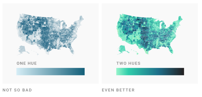Readers are generally better able to distinguish colors on a gradient better if they are encoded through both lightness and two (sometimes three) carefully-selected hues.