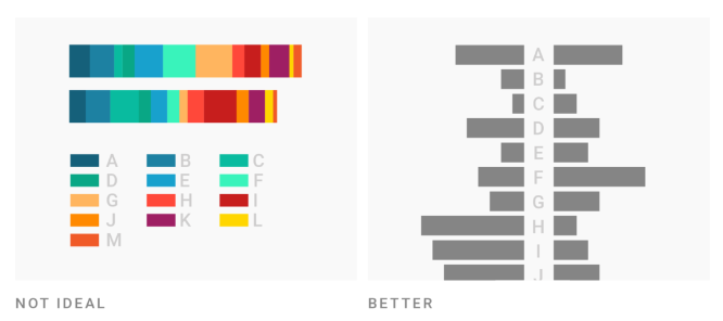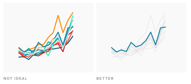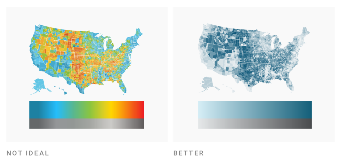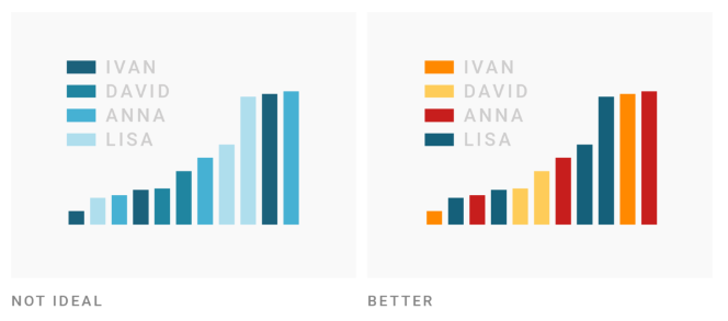 Recall that colors are low on the hierarchy of elementary perceptual tasks. When possible, avoid conveying important information purely through color – consider how you might additionally use shapes, symbols, typography, or annotations.
