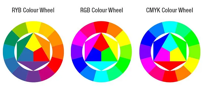 Common color models: RYB (used by painters), RGB (used in electonic displays), CMYK (used in modern printing). Image source: medium.com
