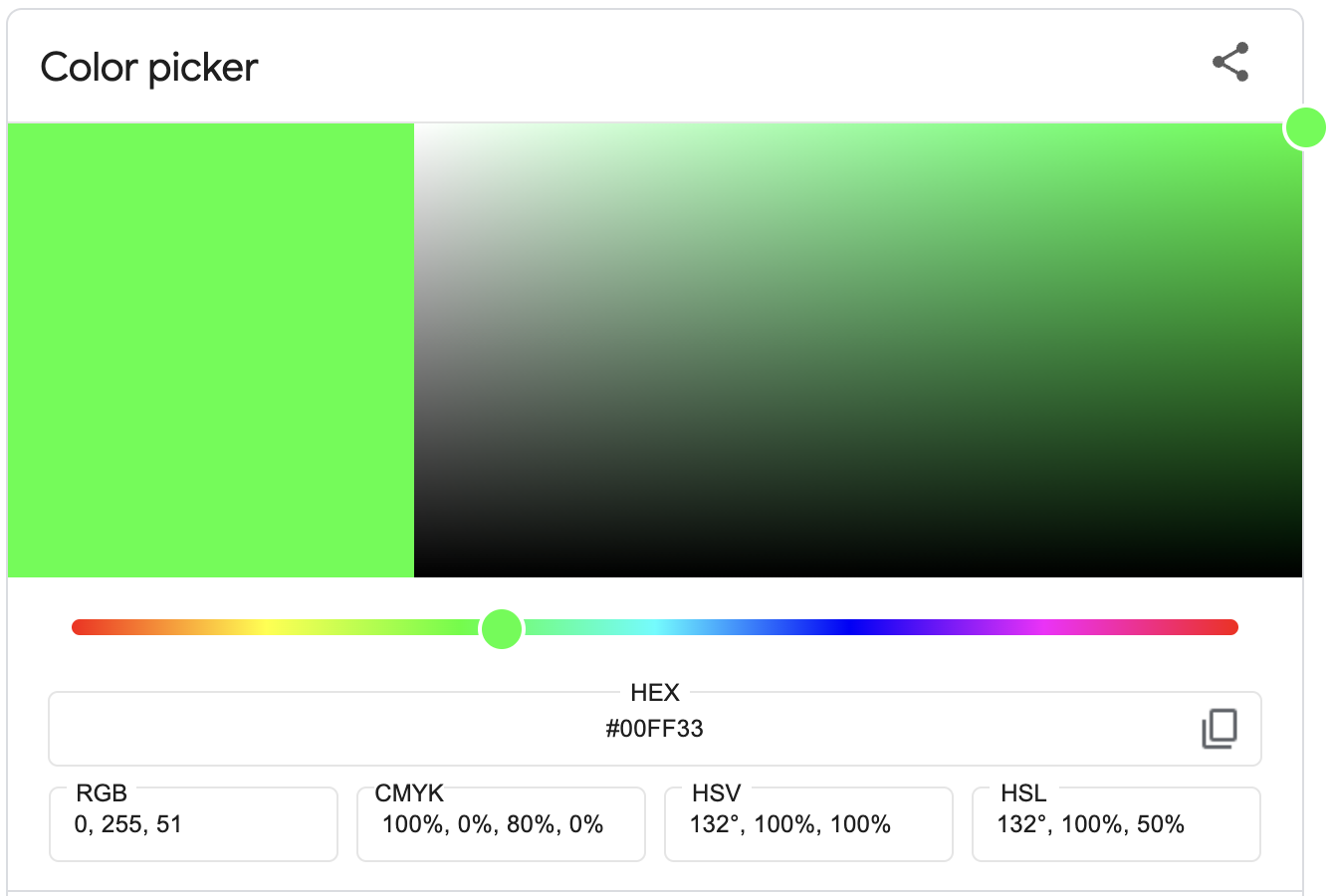 Green (132° on the color wheel) at 100% saturation