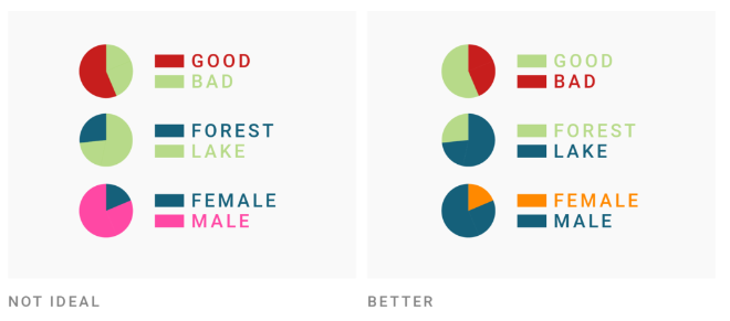 Use intuitive colors (e.g. green for forest, blue for water) but avoid stereotypes (e.g. pink for women, blue for men).
