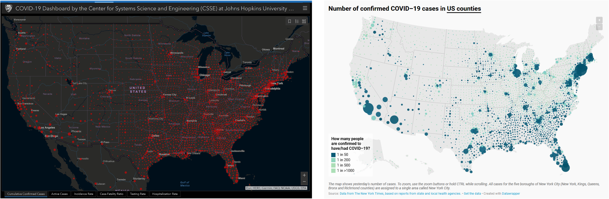 (Right) COVID-19 tracker by the Johns Hopkins University (screenshot from 2020-07-27, courtesy of Cédric Scherer). Red tends to elicit panic / fear. (Left) A map of confirmed COVID-19 cases by Datawrapper (screenshot from 2020-07-27, courtesy of Cédric Scherer). Blues and greens help to avoid such a strong fearful emotional response.
