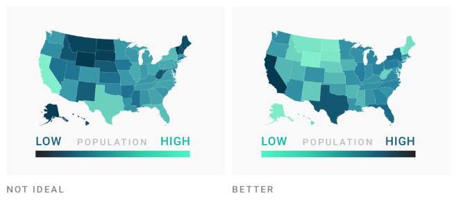 In most cases, readers will associate bright colors with lower values and darker colors with higher values. Build gradients accordingly.
