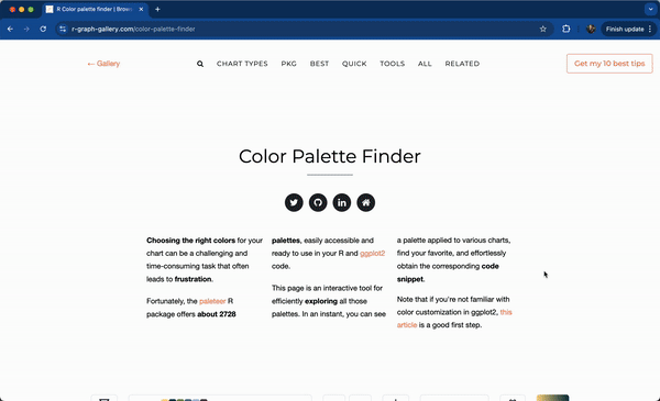 There are a number of ways to browse the extensive list of supported palette packages, including in the {paletter} documentation, on the r-color-palettes GitHub repo, on the R Color Palettes website, the R-Graph Gallery’s Color Palette Finder (built on {paletteer}; see below).