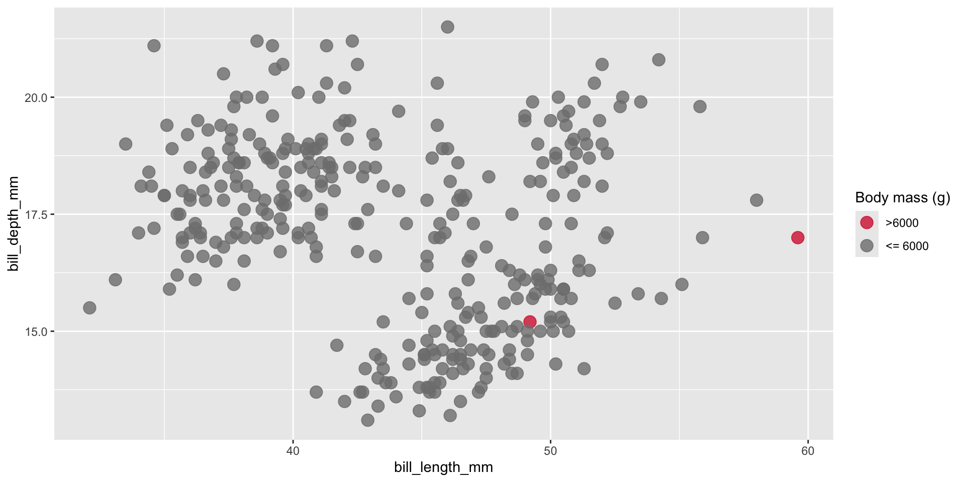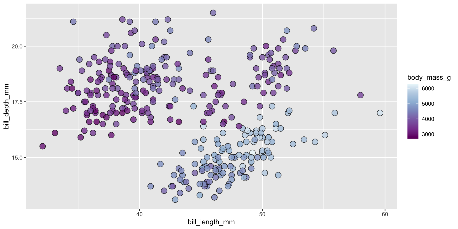 Rather than color points by body_mass_g, we can fill points by body_mass_g. Then, we need to change the shape of our points to 21, which is the code for an outlined, fill-able point: