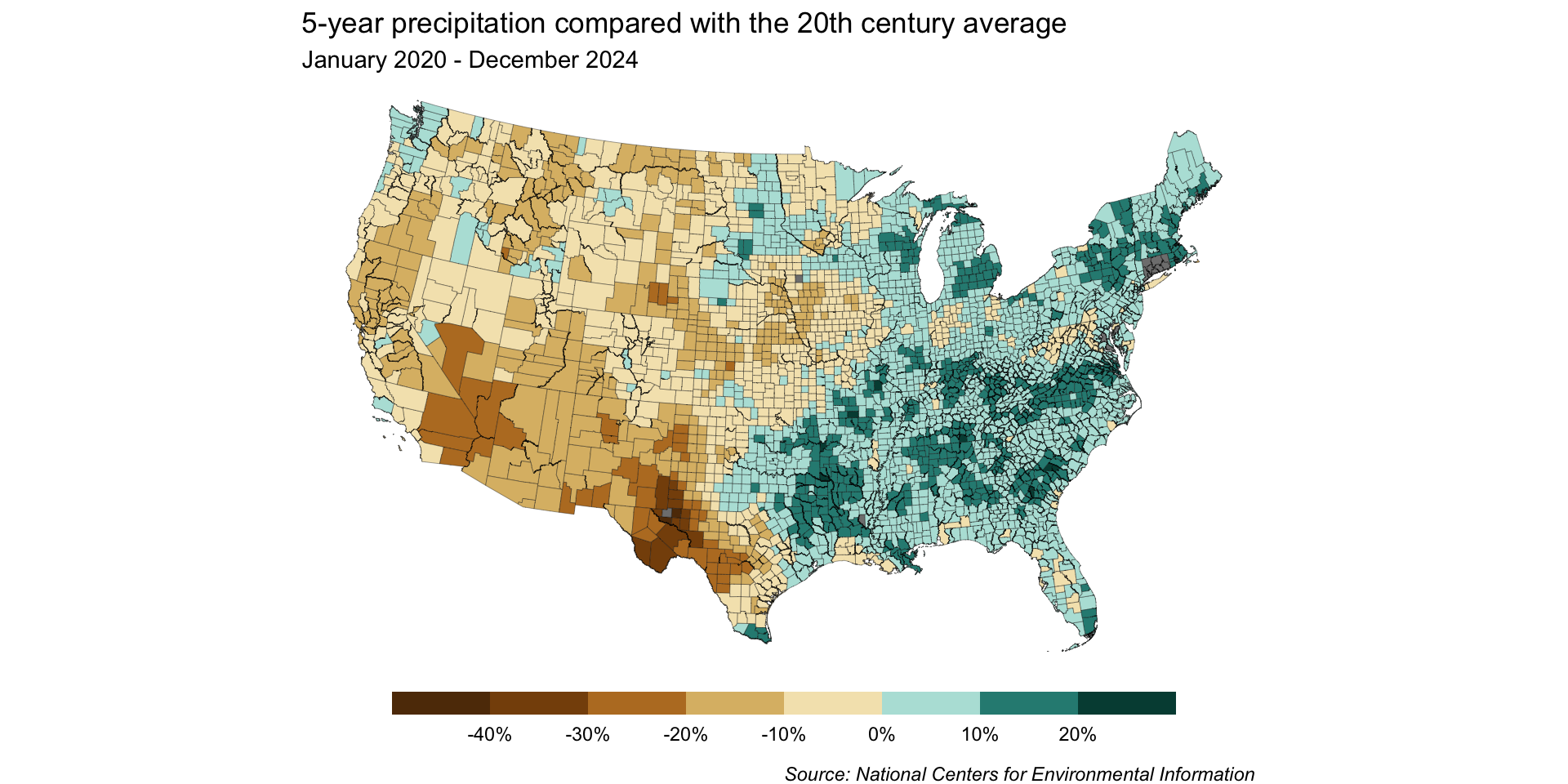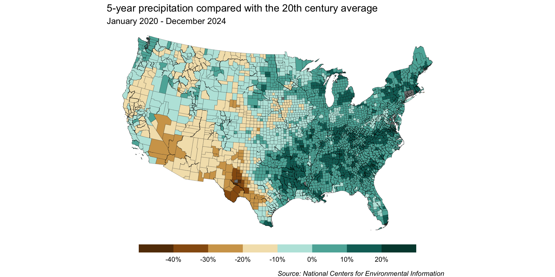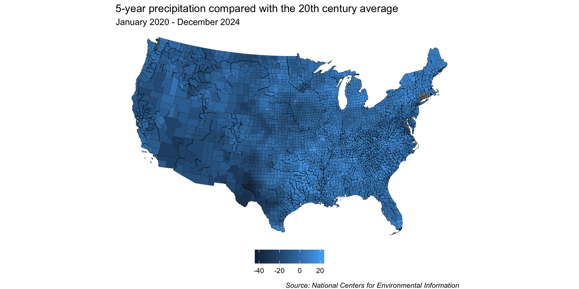 By dropping the off-white hue, we can construct our scale so that 0% sits at the break point between brown and blue shades – any county that received more than the historical average will be a shade of blue, and any that received less will be a shade of brown.