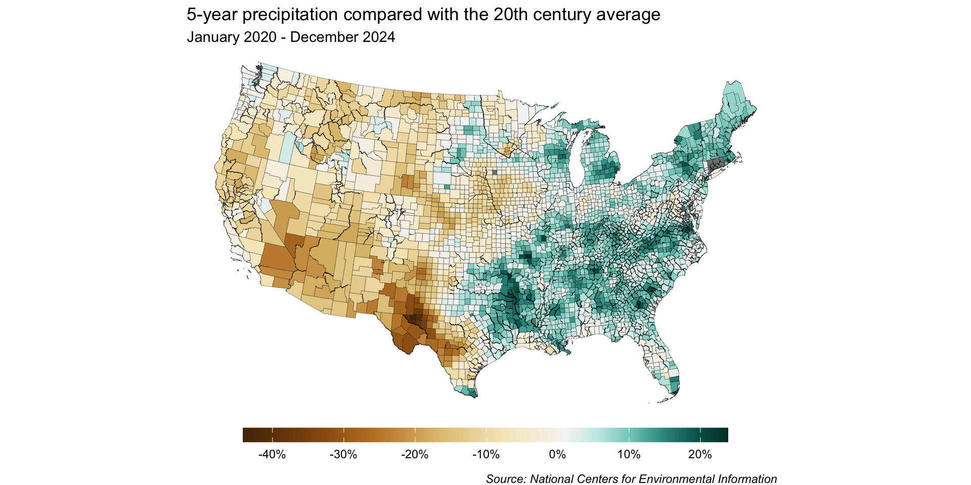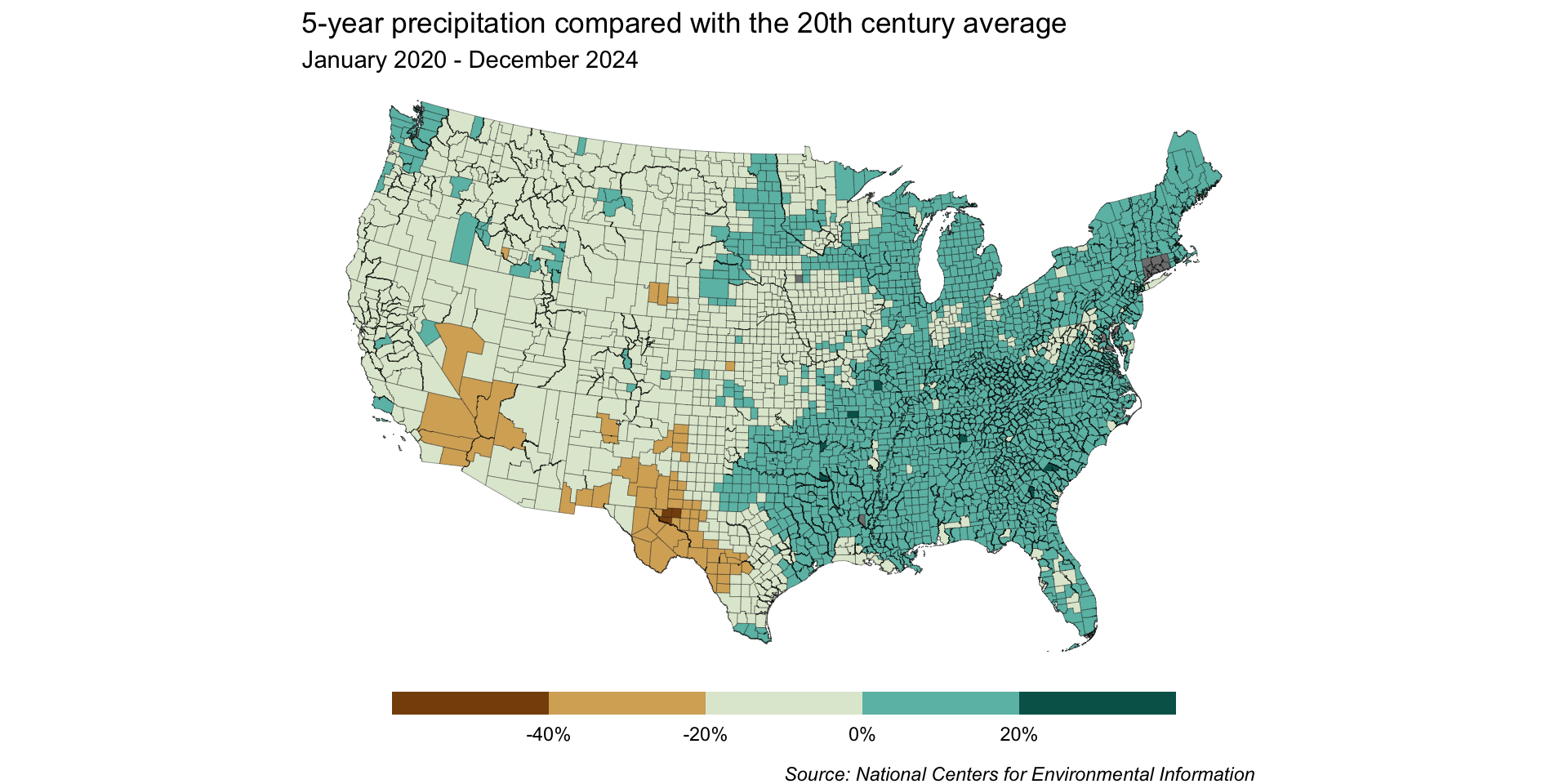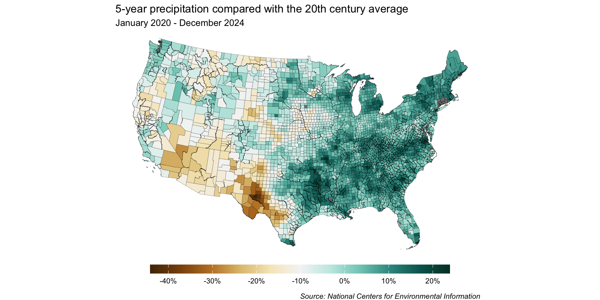 By dropping the off-white hue, we can construct our scale so that 0% sits at the break point between brown and blue shades – any county that received more than the historical average will be a shade of blue, and any that received less will be a shade of brown.