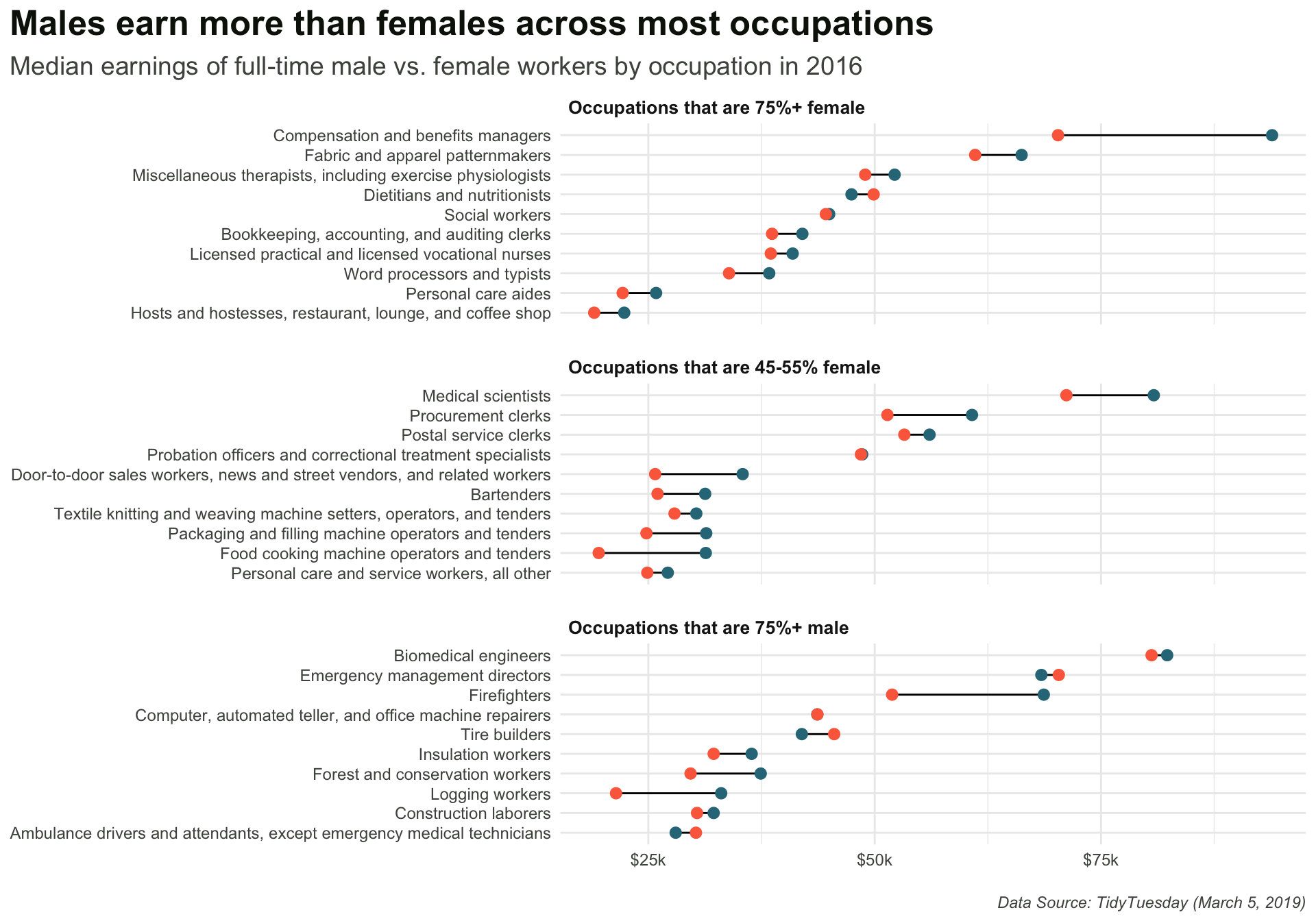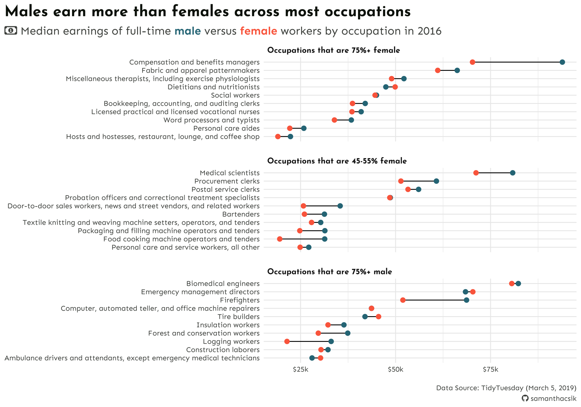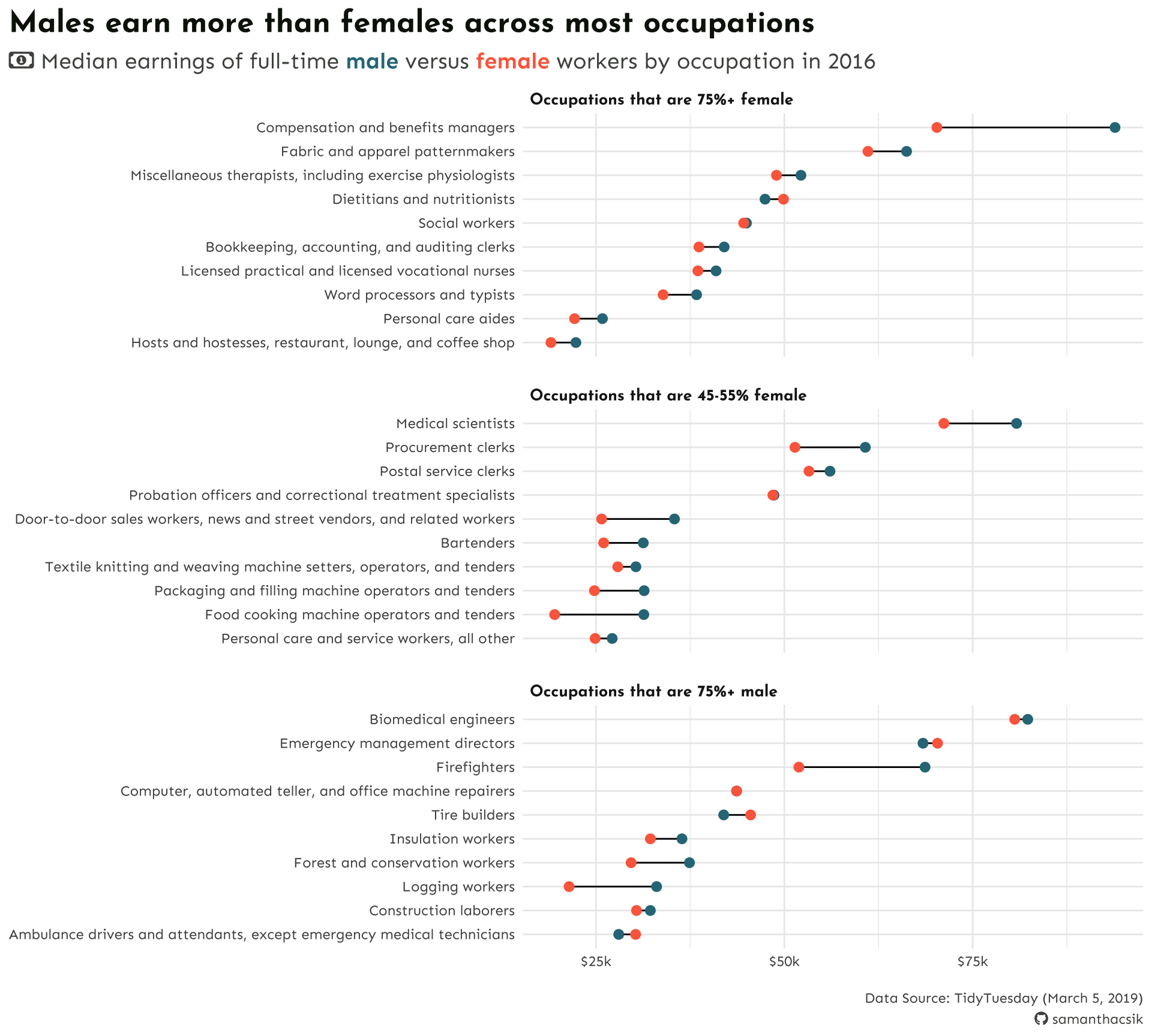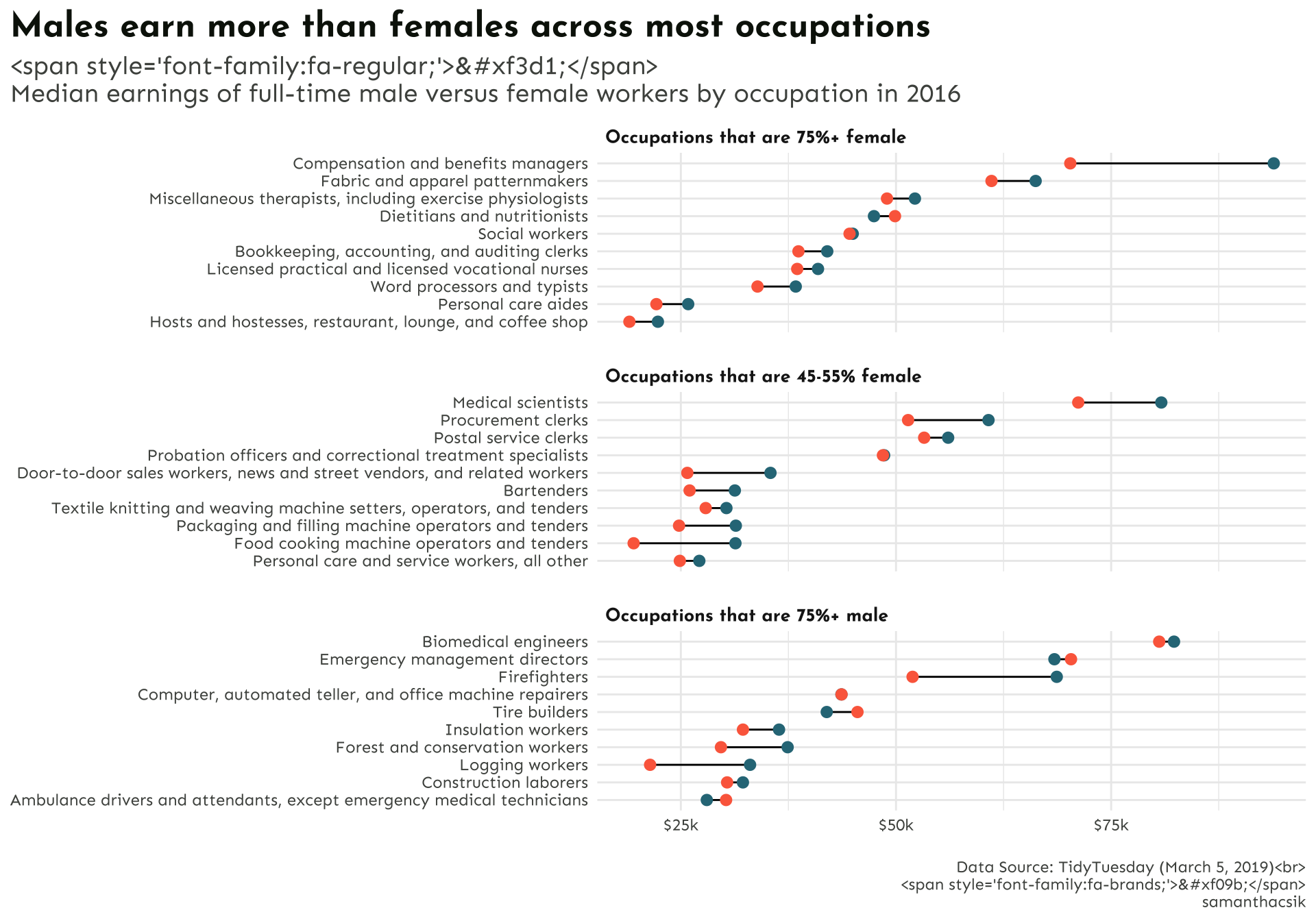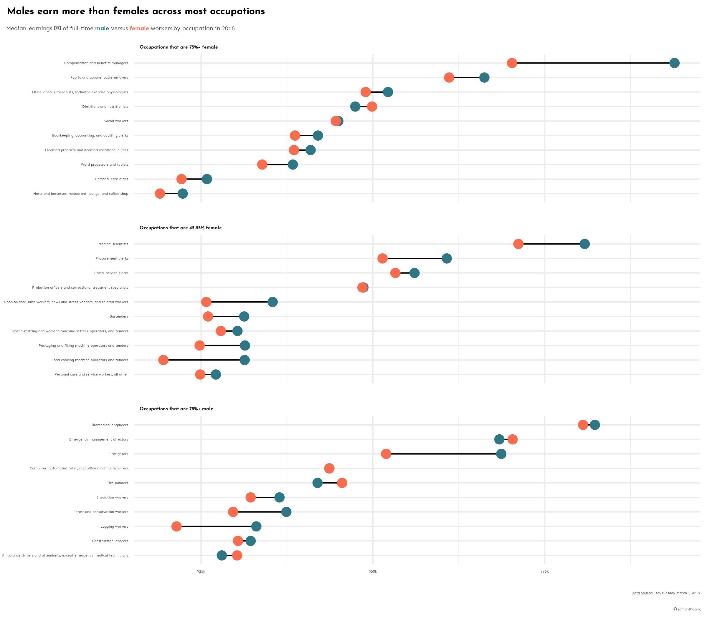 subtitle = "Median earnings of full-time male vs. female workers by occupation in 2016",